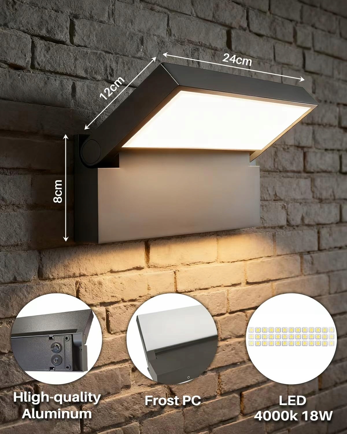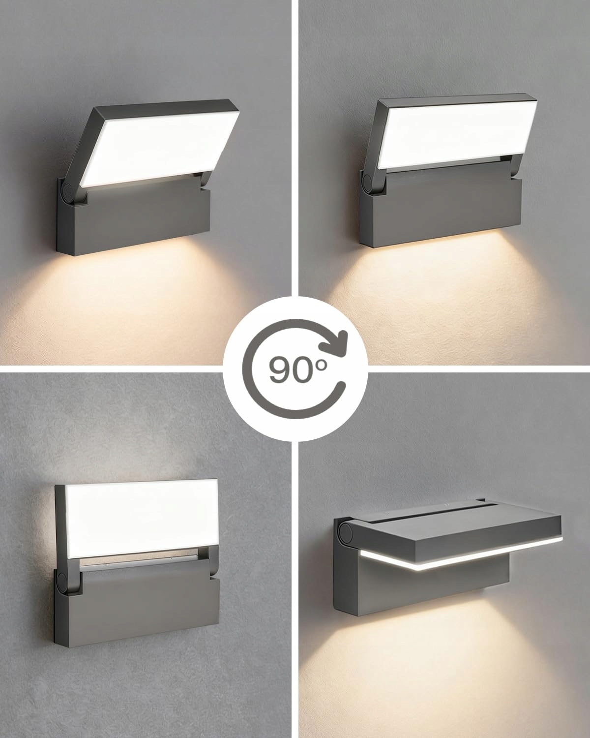 【Obracany o 90° panel LED】Panel LED kinkietów zewnętrznych można obrócić pionowo o 90°. Za pomocą lekkiego ruchu można dostosować kąt oświetlenia kinkietu w górę lub w dół, aby uzyskać pożądany efekt świetlny i stworzyć przyjemną atmosferę świetlną
