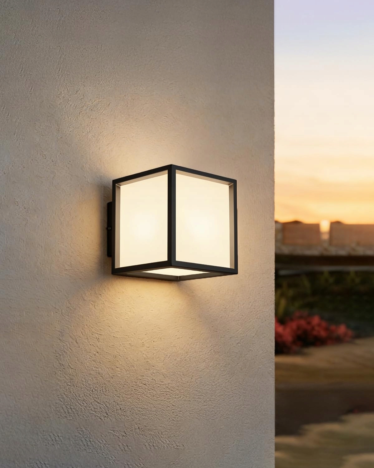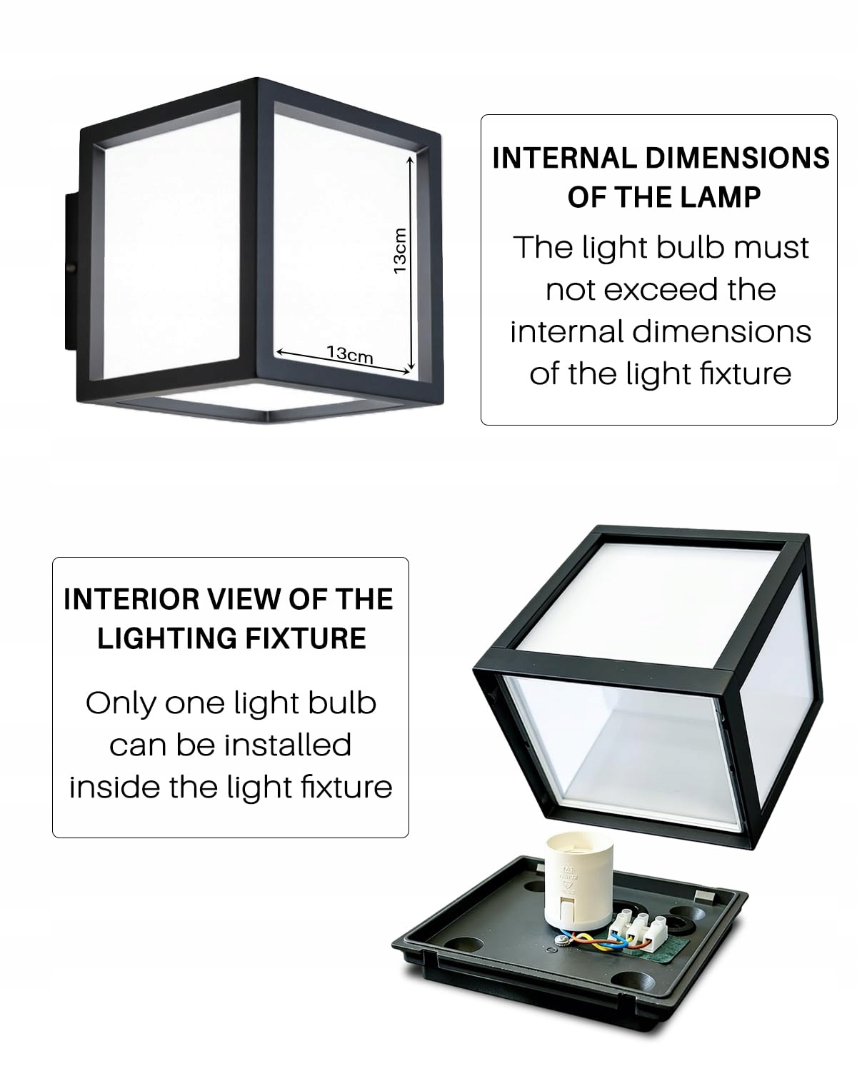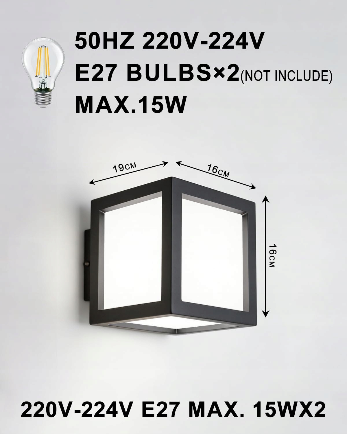 WYMIARY: Kompaktowy kinkiet w kształcie sześcianu z wyraźnymi liniami i białymi dyfuzorami dla równomiernego rozproszenia światła