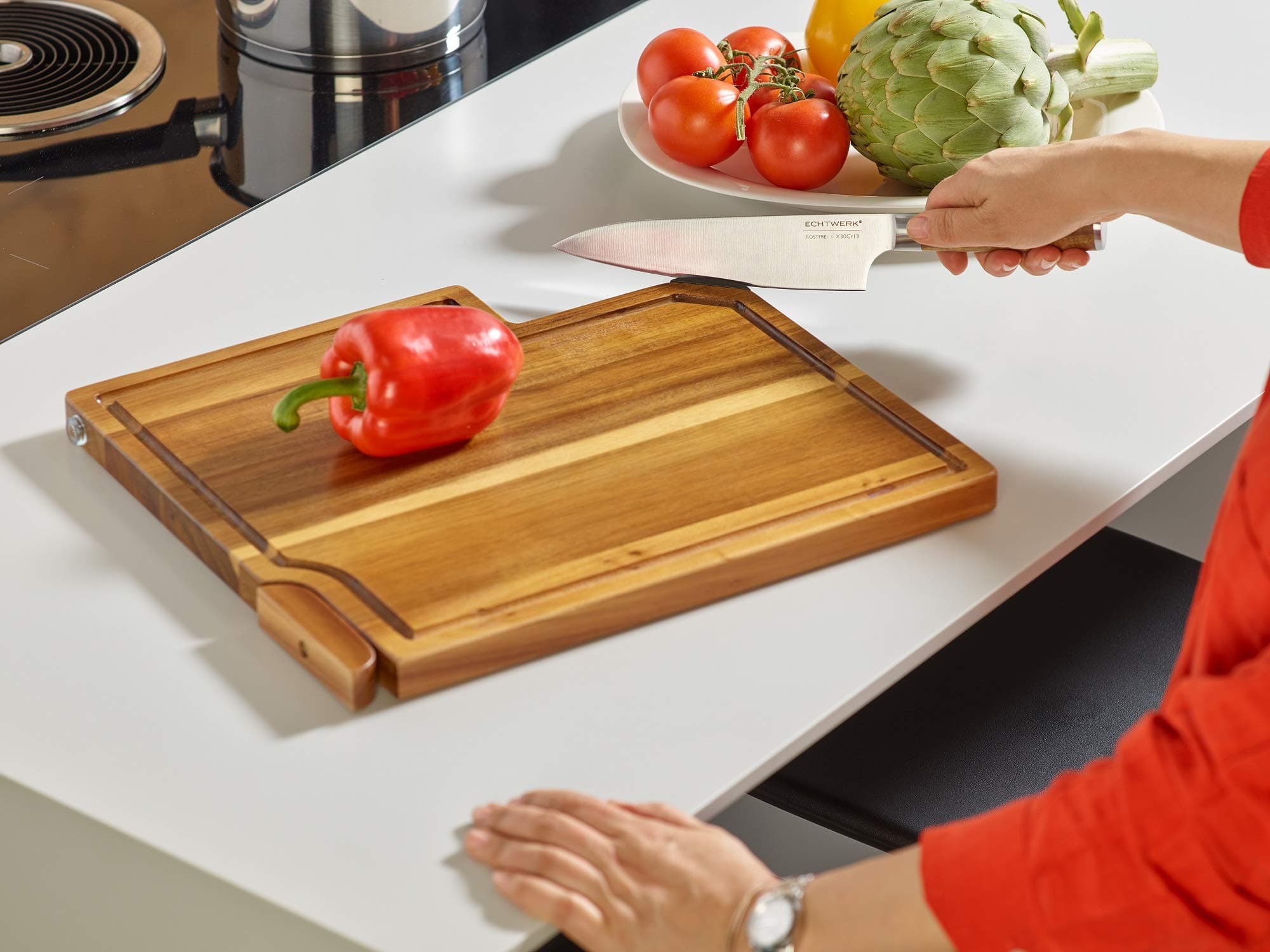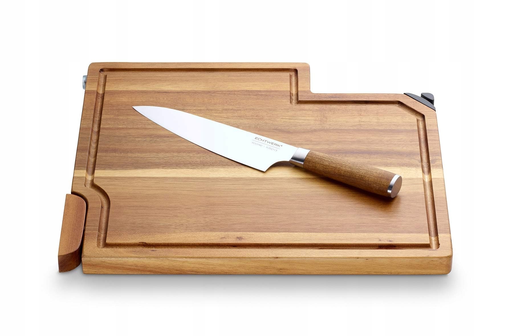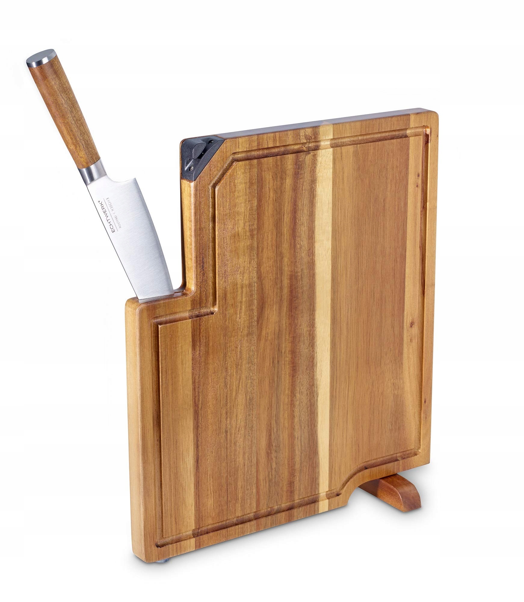 Zestaw noży kuchennych Echtwerk 3 / Deska do krojenia z drewna akacjowego z wbudowanym ostrzałką i nożem kuchennym (20 cm) / Deska do krojenia - deska serwisowa - deska do gotowania i krojenia