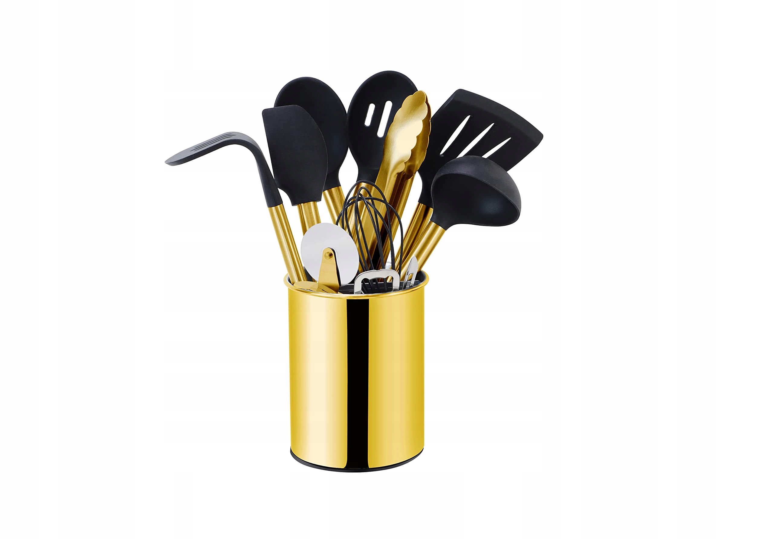 ZAWARTOŚĆ ZESTAWU - Uchwyt na przybory, łopatka szczelinowa, łyżka stała, trzepaczka, łyżka do zupy, łyżka szczelinowa, skrobak kuchenny, tłuczek do ziemniaków, szczypce do serwowania, otwieracz do butelek, nóż do pizzy, obieraczka do warzyw.