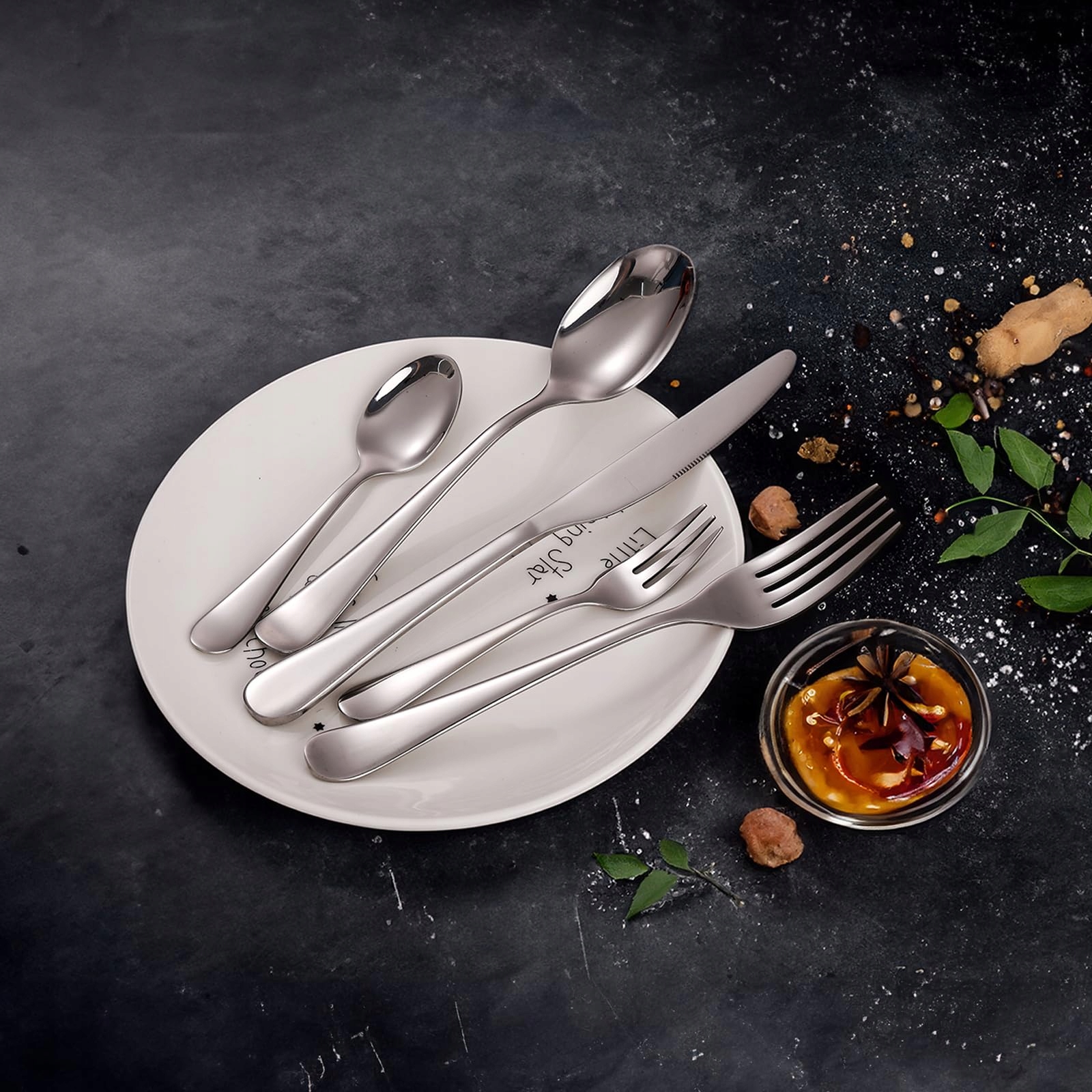 KOMPLET DLA 6 OSÓB: Z 6 nożami do jedzenia, 6 widelcami, 6 łyżkami do jedzenia, 6 łyżeczkami do kawy i 6 widelczykami do ciasta, idealny dla rodzin lub małych grup.