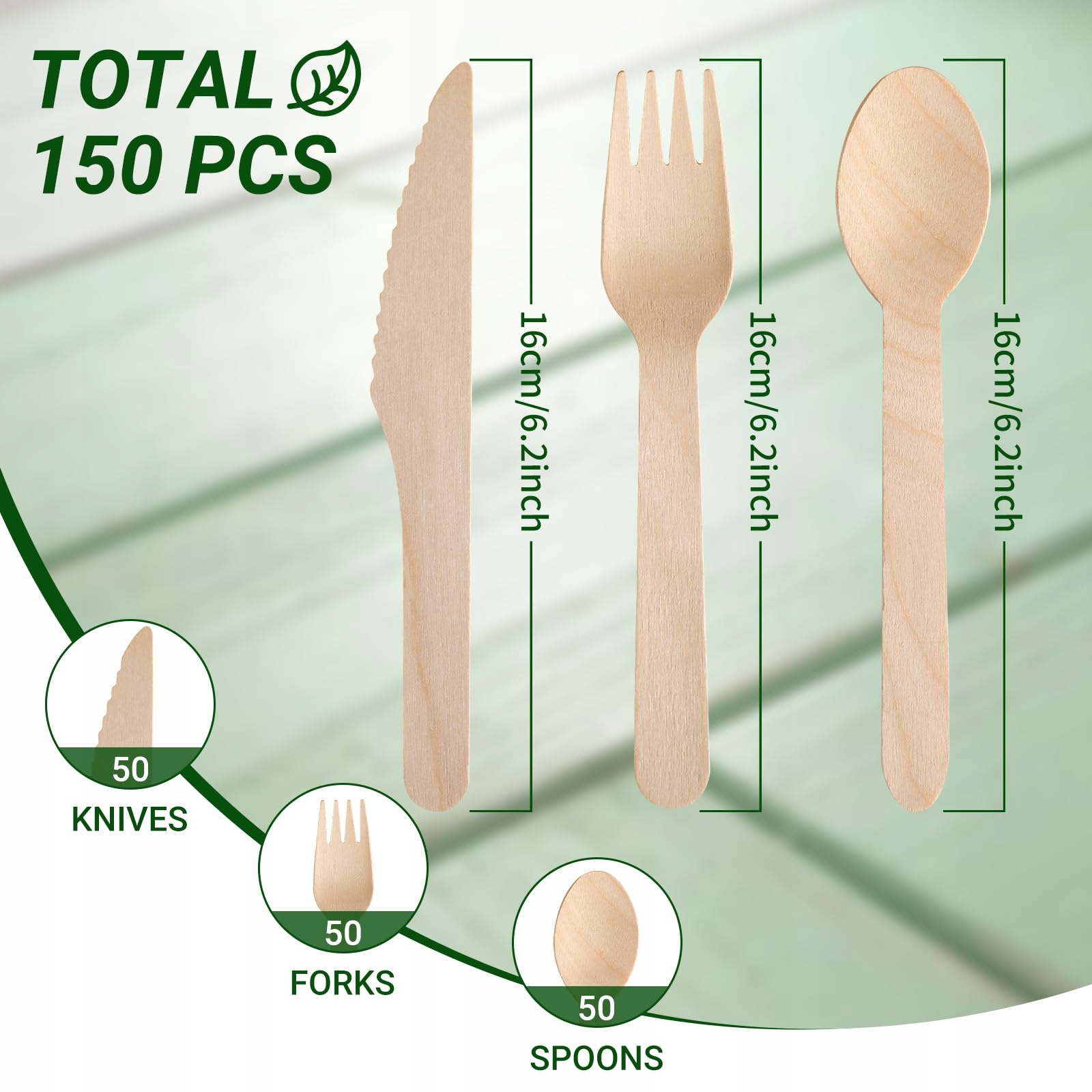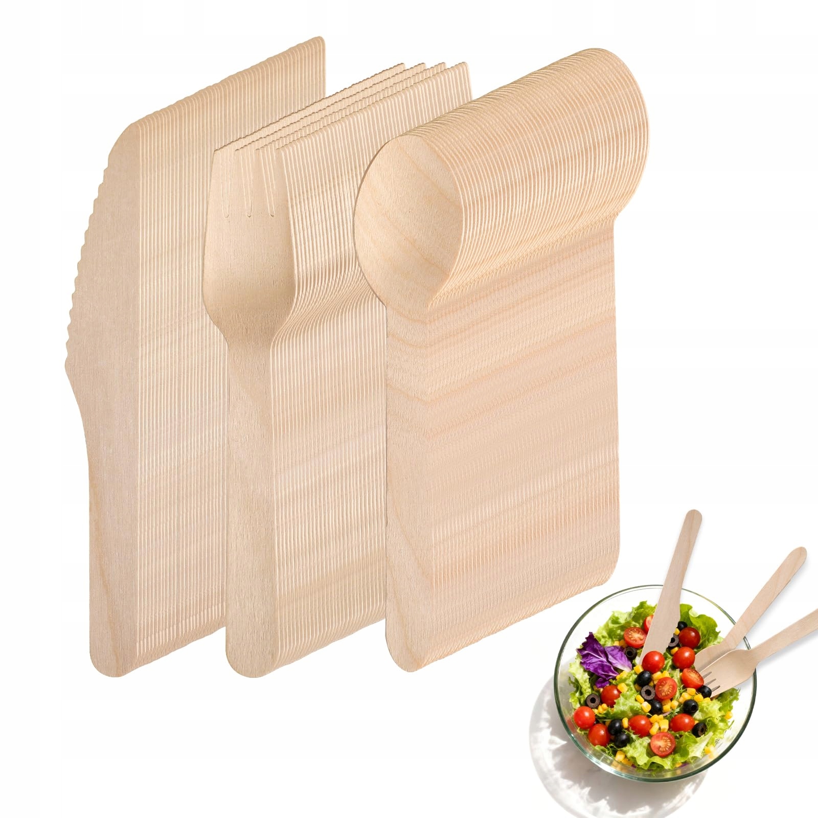 Opakowanie zapasowe – Duże opakowanie zawierające 150 części (noże, widelce, łyżki). Wystarczająco dużo drewnianych sztućców na wydarzenia, imprezy i uroczystości. Zrównoważona alternatywa dla tradycyjnych jednorazowych naczyń i plastikowych sztućców.