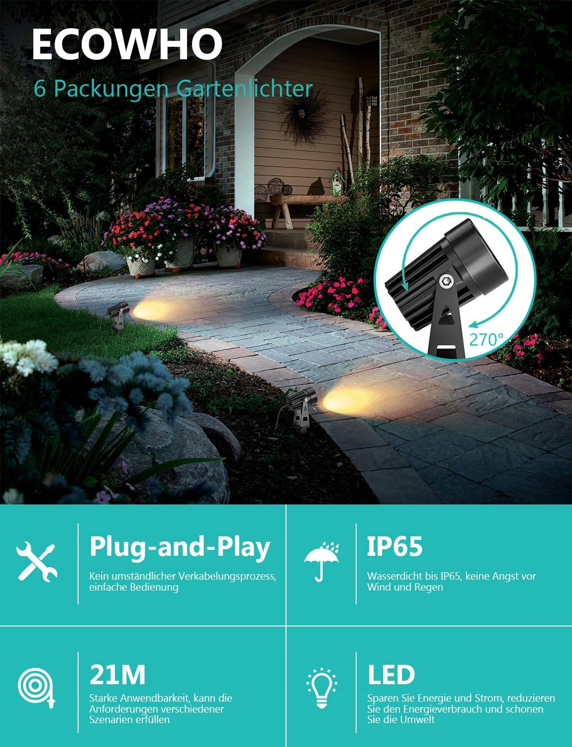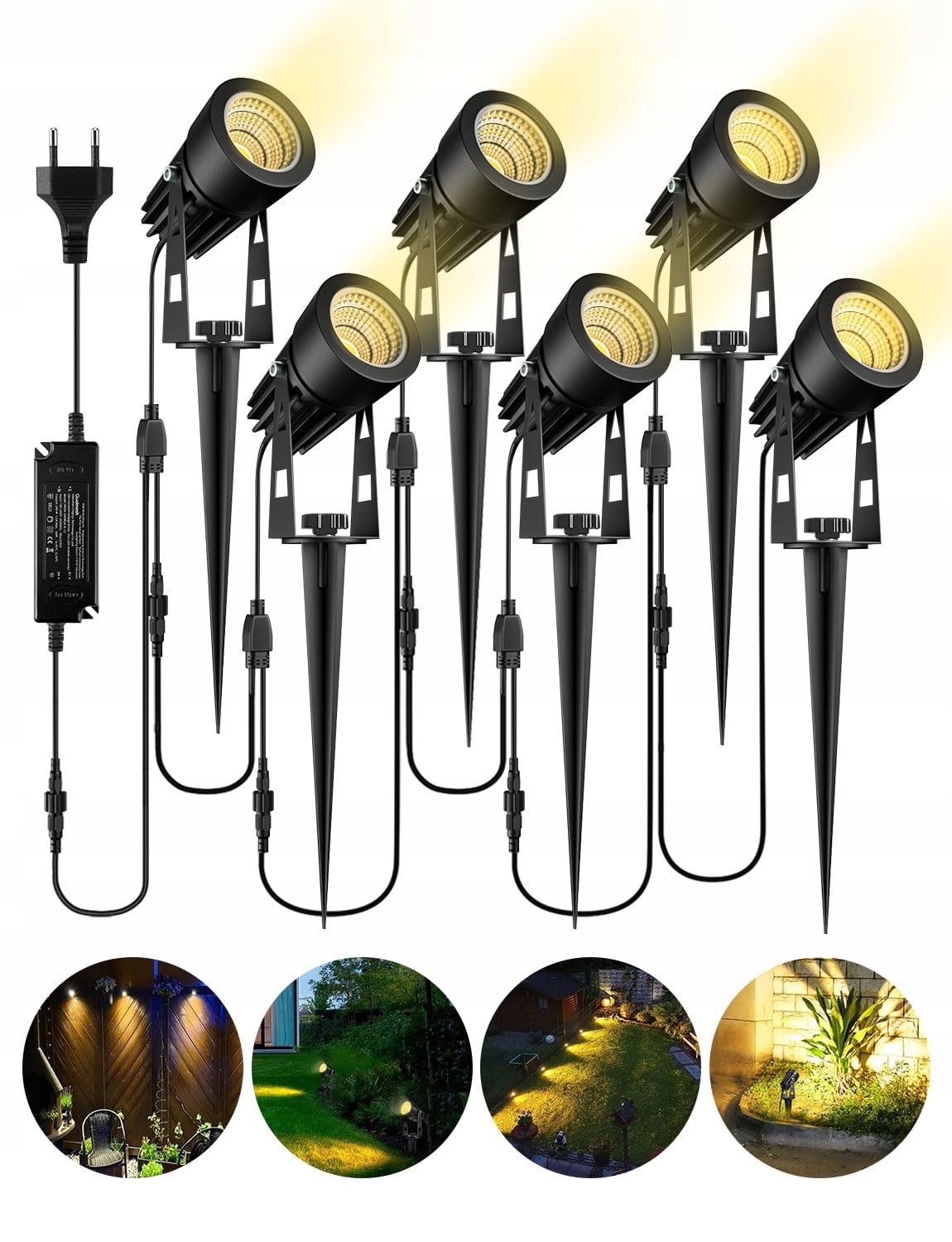 ECOWHO Oświetlenie ogrodowe 6-częściowy zestaw lamp ogrodowych z kolcem, IP65 wodoodporne reflektory LED z wtyczką, ciepłobiały reflektor lampa ogrodowa oświetlenie ścieżki idealne do ogrodu, drzew, żywopłotów