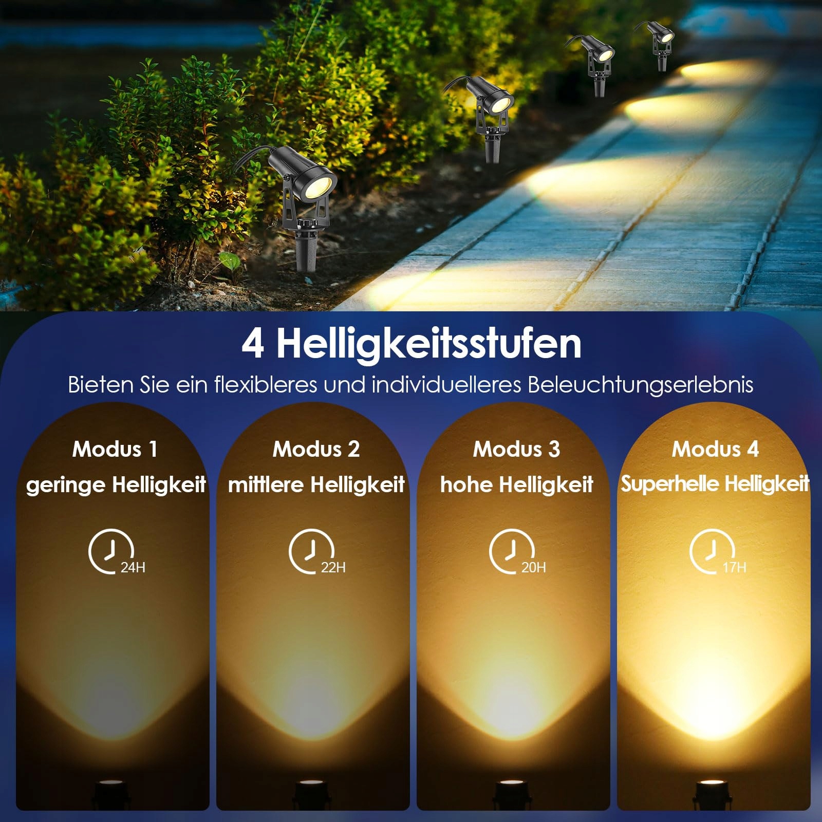 [4-stopniowa funkcja ściemniania]To solarne oświetlenie ogrodowe jest wyposażone w pilot i zasilanie, dzięki czemu możesz dowolnie sterować światłem. 4 tryby jasności: ① Niska jasność - do 24 godzin świecenia ② Średnia jasność - do 22 godzin świecenia ③ Wysoka jasność - do 20 godzin świecenia ④ Super jasność - do 17 godzin świecenia. Dzięki funkcji ściemniania możesz dostosować intensywność światła w zależności od otoczenia, aby stworzyć ciepłą i przytulną atmosferę w swoim solarnym oświetleniu ogrodowym.