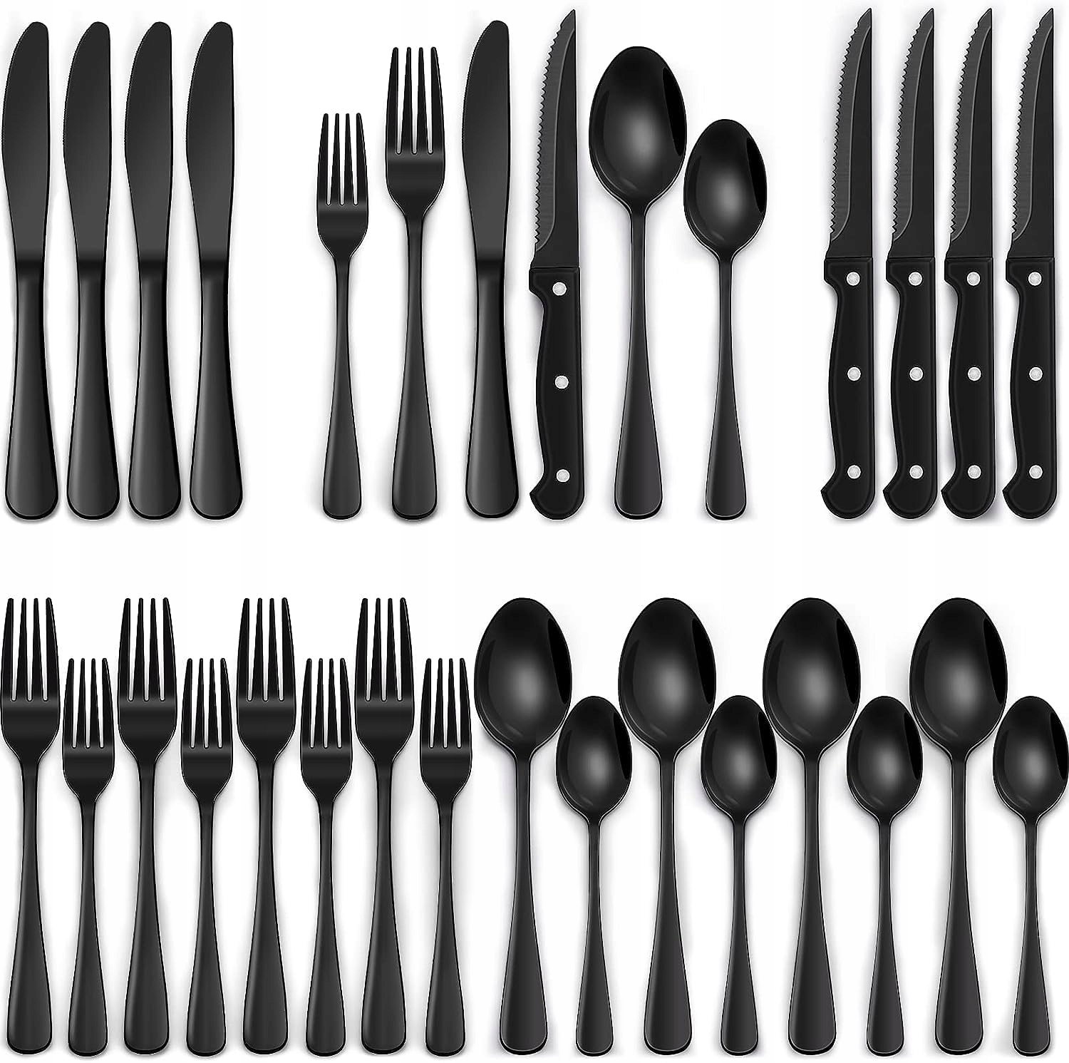 Zestaw sztućców dla 6 osób czarny, 36-elementowy zestaw sztućców ze stali nierdzewnej z nożem do steków, zestaw sztućców z nożem, widelcem, łyżką, eleganckie sztućce do restauracji/imprezy, nadające się do mycia w zmywarce
