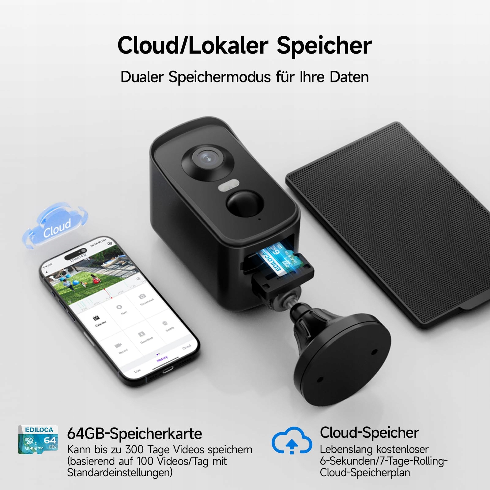【64 GB wbudowanej pamięci & 7 dni bezpłatnego przechowywania w chmurze】: Kamera monitoringu posiada wbudowaną pamięć 64 GB, która wystarcza na ponad 90 dni nagrań (na podstawie 100 wykryć dziennie z 1 minutą nagrania). Dodatkowo oferuje dożywotnie, bezpłatne 7-dniowe przechowywanie w chmurze z automatycznym nadpisywaniem (6 sekund na wideo). Zapewnia to maksymalne bezpieczeństwo danych bez dodatkowych kosztów.