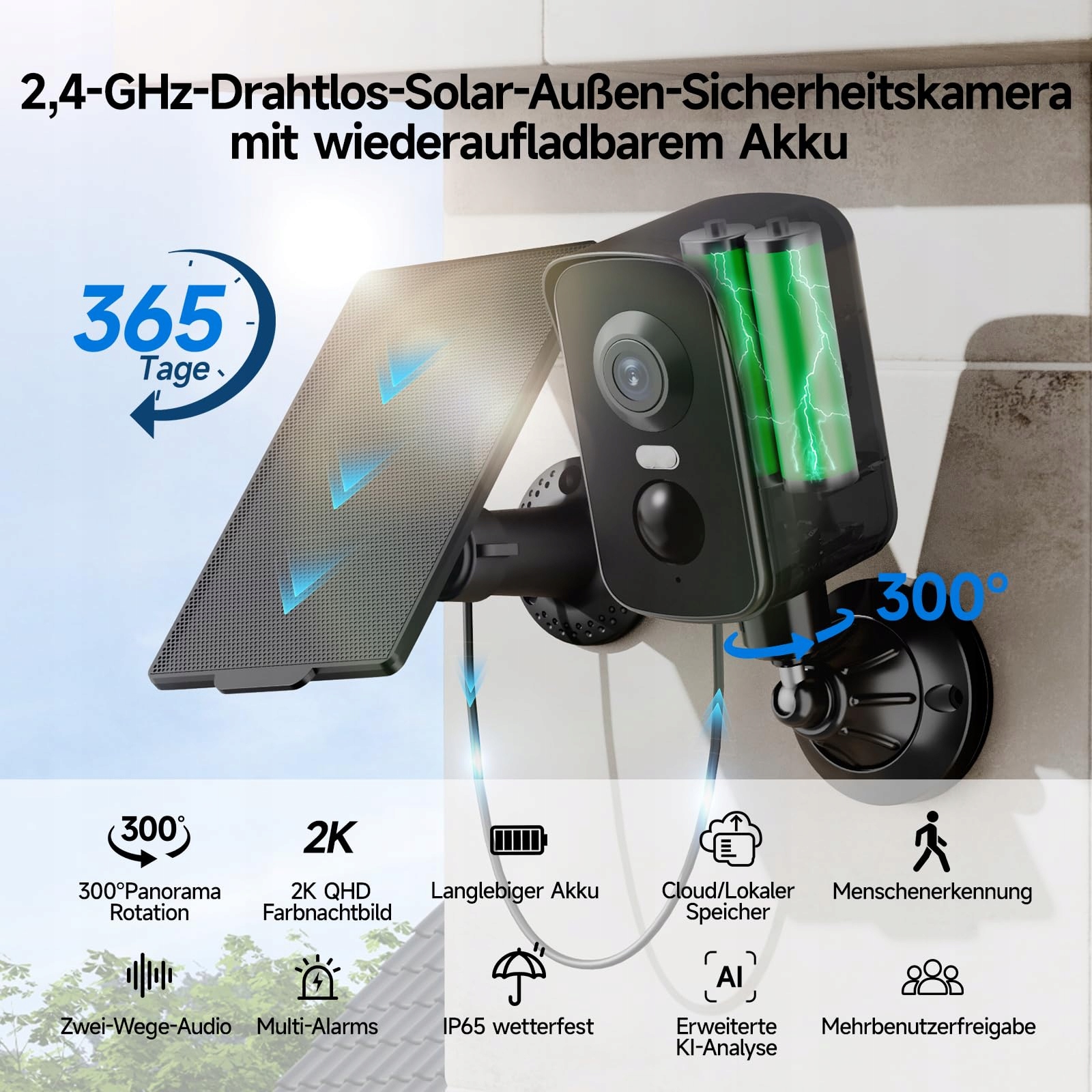 【100% bezprzewodowa & zasilana energią słoneczną】: Wyposażona w akumulator wielokrotnego ładowania oraz panel słoneczny, ta kamera monitoringu zewnętrznego zapewnia ciągłe zasilanie bez uciążliwego ładowania. Nawet przy złych warunkach pogodowych wbudowany akumulator gwarantuje nieprzerwaną obserwację. Idealna do elastycznego umiejscowienia bez plątaniny kabli. (Uwaga: obsługuje tylko Wi-Fi 2,4 GHz, nie 5 GHz.)