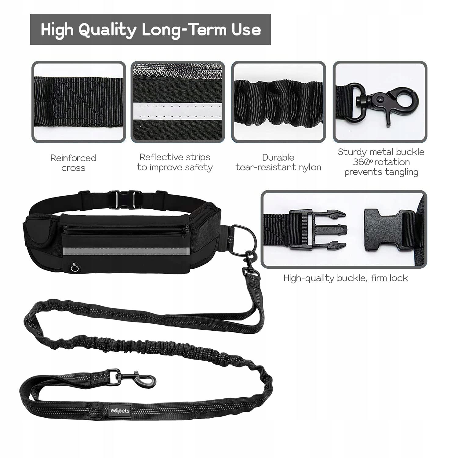 Edipets, smycz do biegania dla psów, bez użycia rąk, bieganie, wędrówki, taśma, anty-stres, odblaskowa, 160-220 cm (czarna)