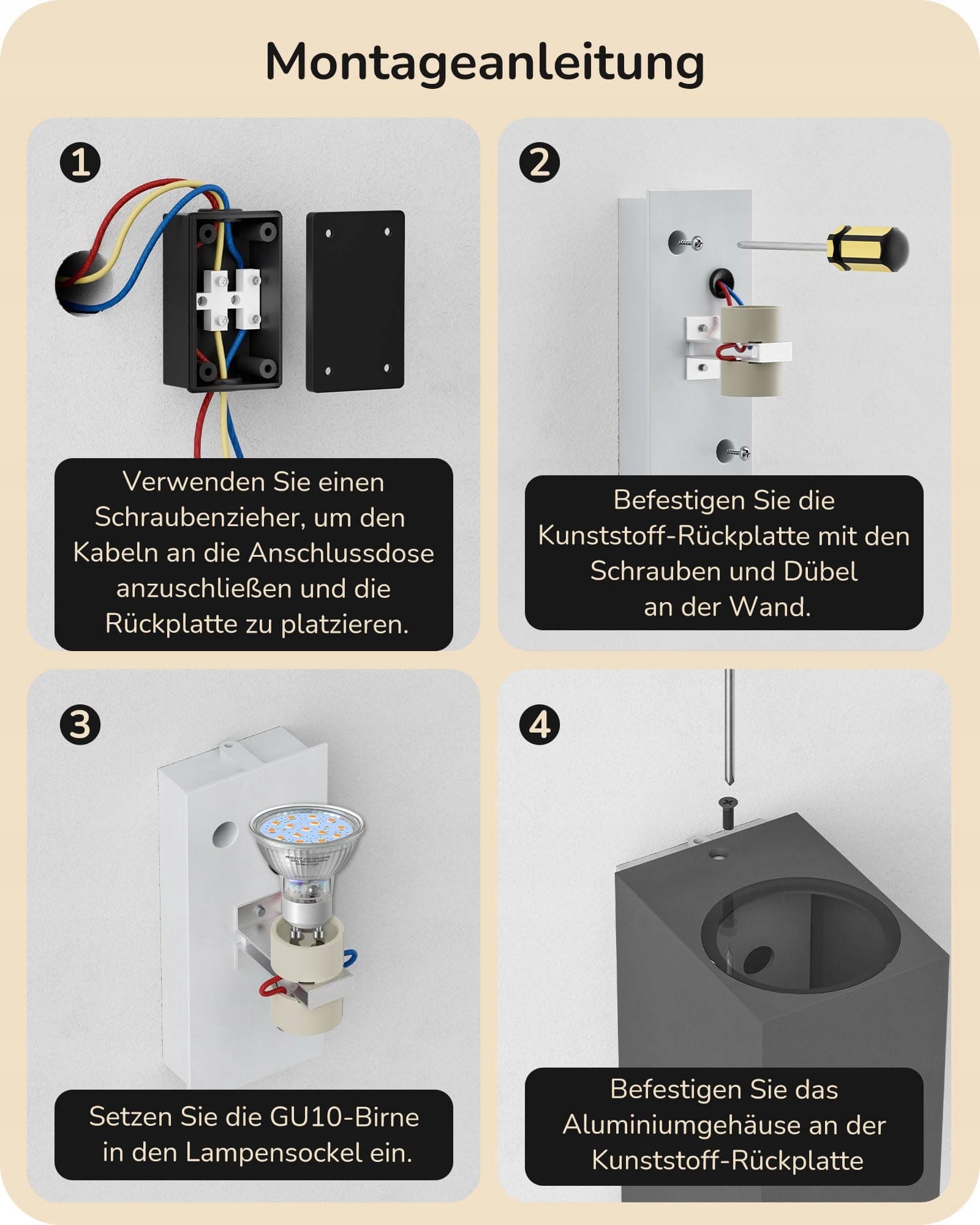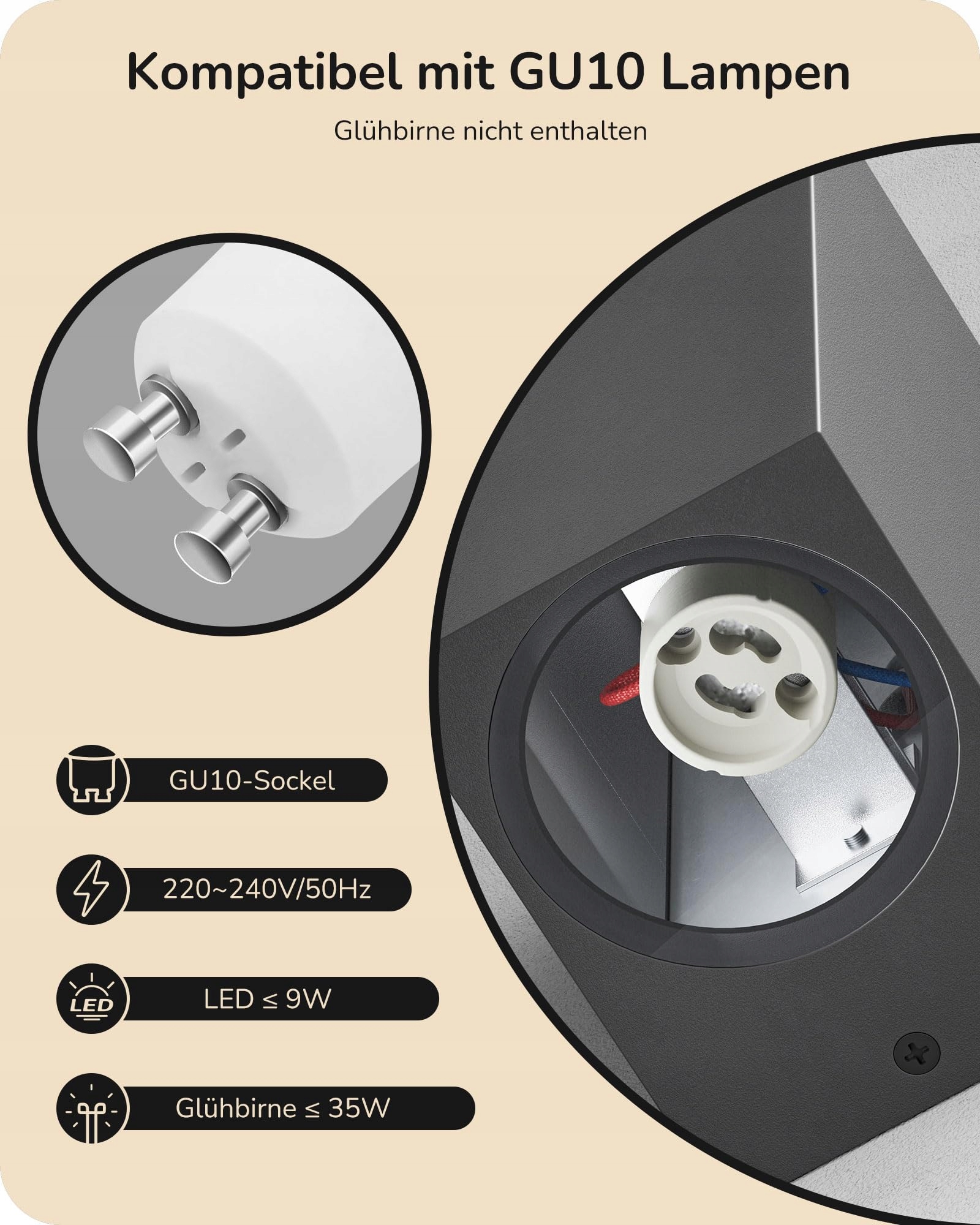Oprawka GU10: zestaw 2 kinkietów wyposażony jest w standardową oprawkę GU10, kompatybilną z lampami LED do 9W oraz żarówkami do 35W (źródła światła nie są dołączone), aby spełnić różne potrzeby oświetleniowe.