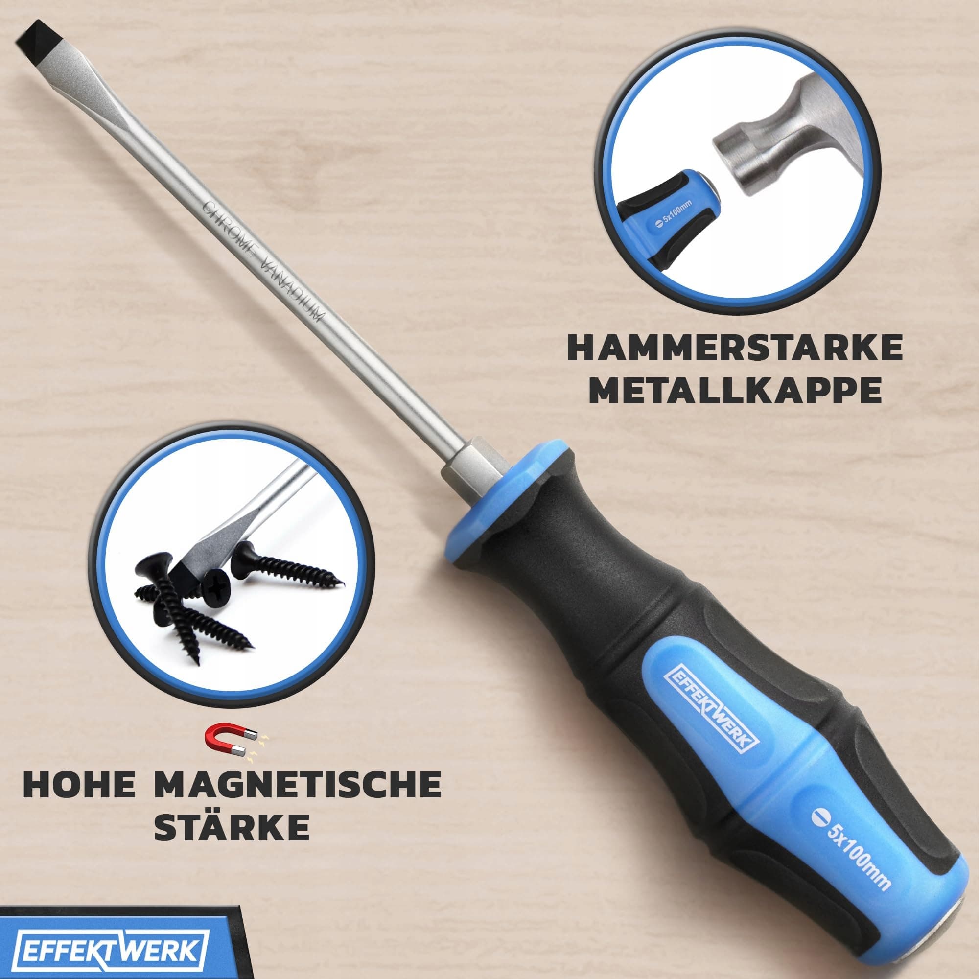 EffektWerk - 6-częściowy zestaw wkrętaków z solidnymi metalowymi końcówkami - 4 wkrętaki płaskie i 2 wkrętaki krzyżakowe z magnetycznymi końcówkami i ergonomicznymi uchwytami