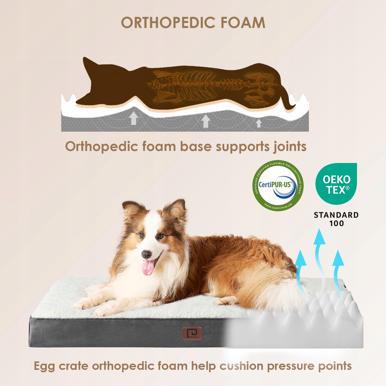 Pianka w kształcie jajka: Wnętrze naszych poduszek dla psów jest wypełnione pianką o kształcie jajka. Pianka w kształcie jajka redukuje nacisk i dopasowuje się do kształtu ciała psa. Legowiska dla psów mają pozytywny wpływ na stawy i mięśnie Twojego psa.