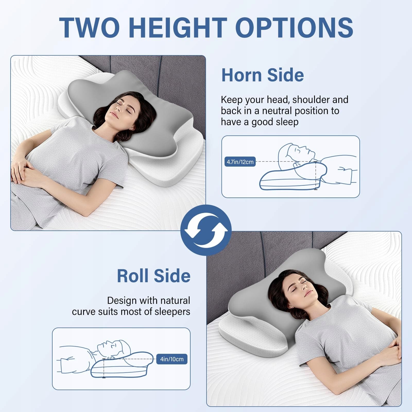 【Dwie ergonomiczne wysokości】Wybierz niższy profil (ok. 10–11 cm) dla osób śpiących na plecach lub wyższy profil (ok. 12–13 cm) dla osób śpiących na boku. Ta starannie przemyślana różnica wysokości zapewnia optymalne wsparcie szyi i kręgosłupa w każdej pozycji do spania, zapobiega sztywności i bólowi oraz sprzyja zdrowej postawie ciała dla bardziej regenerującego snu