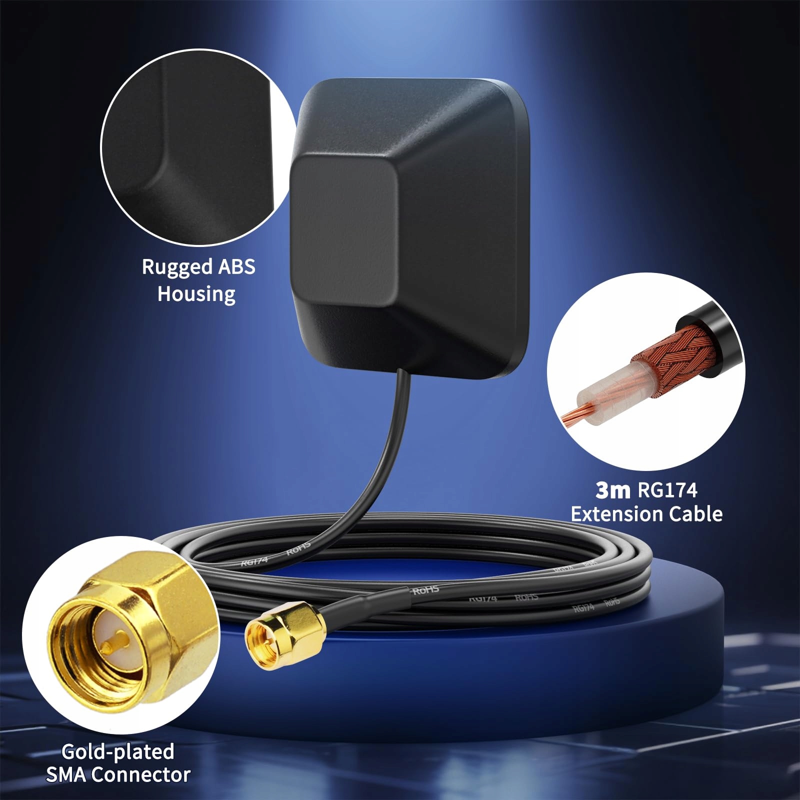 Posiada klasę szczelności IP67, co oznacza, że wytrzymuje trudne warunki pogodowe. Obudowa z materiału ABS zapewnia trwałość i długotrwałe użytkowanie. Wtyczka kabla antenowego to wtyk SMA.