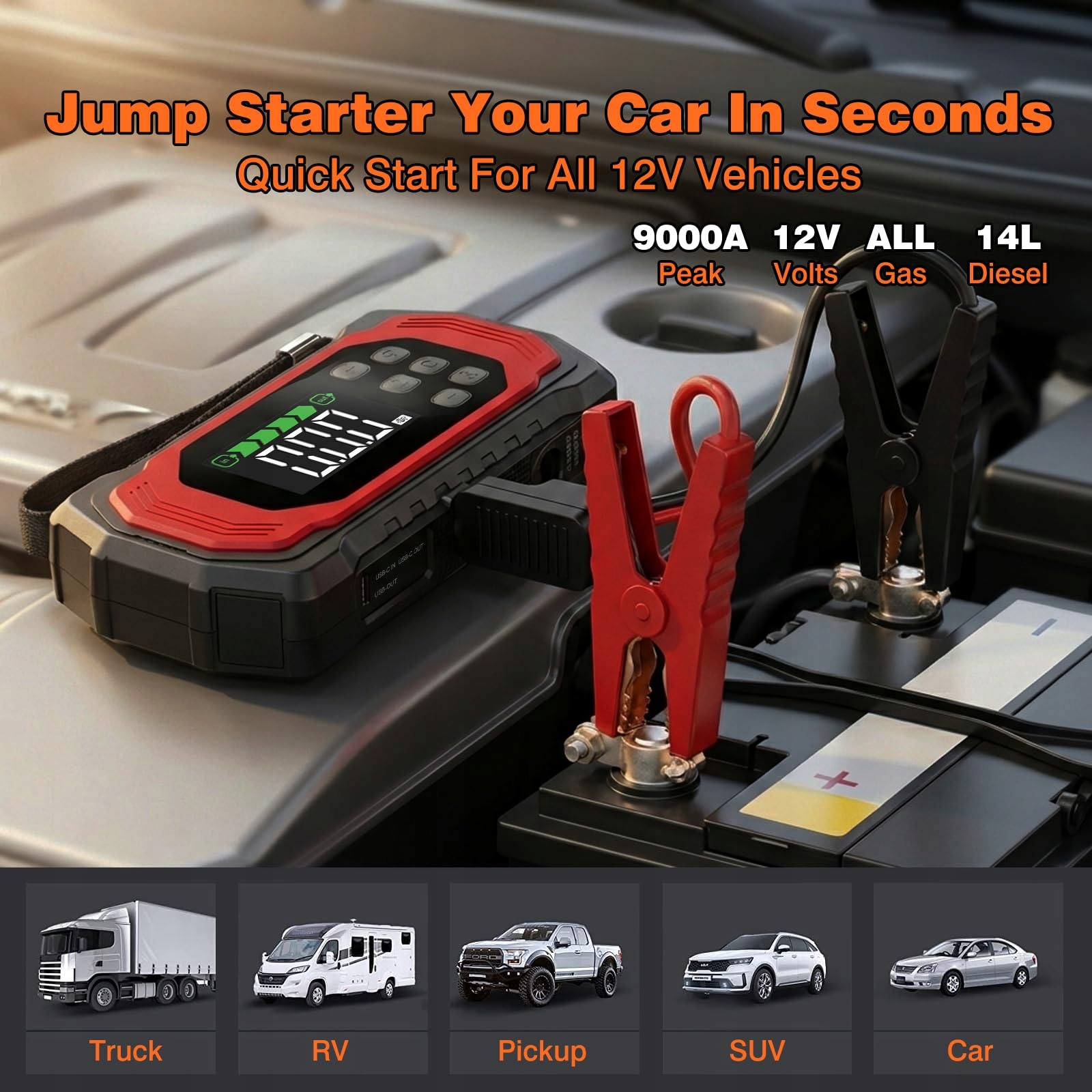 [9000A prąd szczytowy] Rozruch samochodowy PD-F130 oferuje prąd szczytowy 9000A i może w kilka sekund uruchomić pojazdy 12V z silnikami benzynowymi lub do 14,0L diesla – nawet w ekstremalnych temperaturach od -20°C do +60°C. Idealny dla SUV-ów, ciężarówek, kosiarek, motocykli i innych pojazdów.