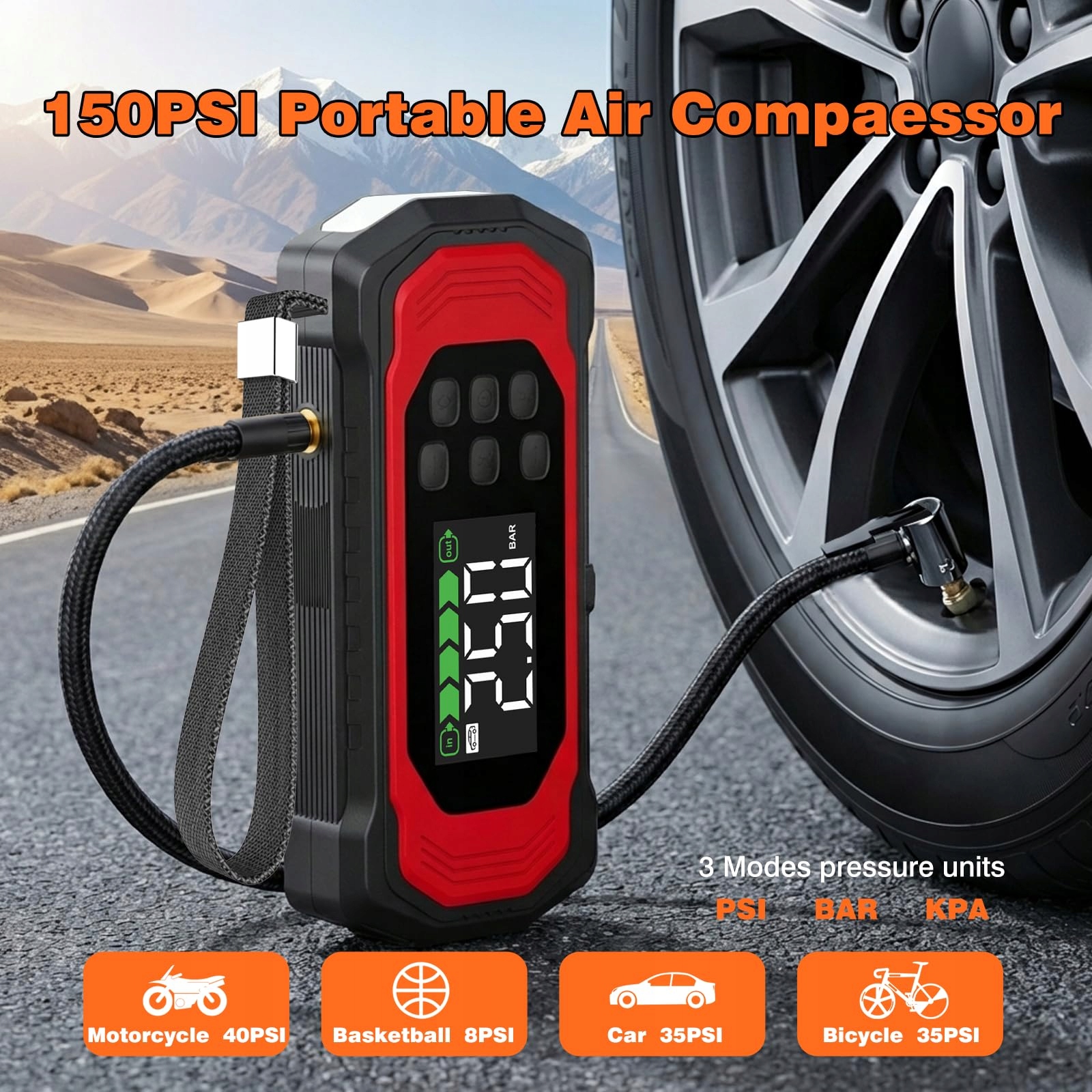 [Kompresor 150PSI] Kompresor oferuje 5 wstępnie ustawionych trybów pompowania (samochody, motocykle, rowery, piłki i tryb niestandardowy), obsługuje 3 jednostki pomiarowe (PSI/BAR/KPA) i zawiera 4 dysze do różnych zastosowań. Automatycznie zatrzymuje się na ustawionej wartości – bez potrzeby ciągłej regulacji.