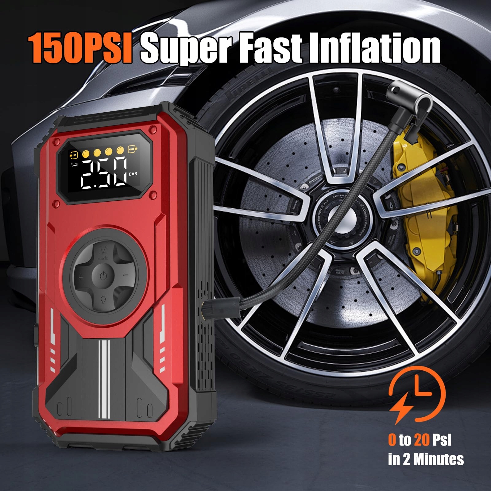 [Powerbank rozruchowy 7 w 1] Ten wydajny rozruch łączy 7 praktycznych funkcji dla wszystkich Twoich potrzeb: rozruch, kompresor powietrza, miernik ciśnienia w oponach, oświetlenie 3-stopniowe (latarka, stroboskop, SOS) oraz przenośny powerbank.