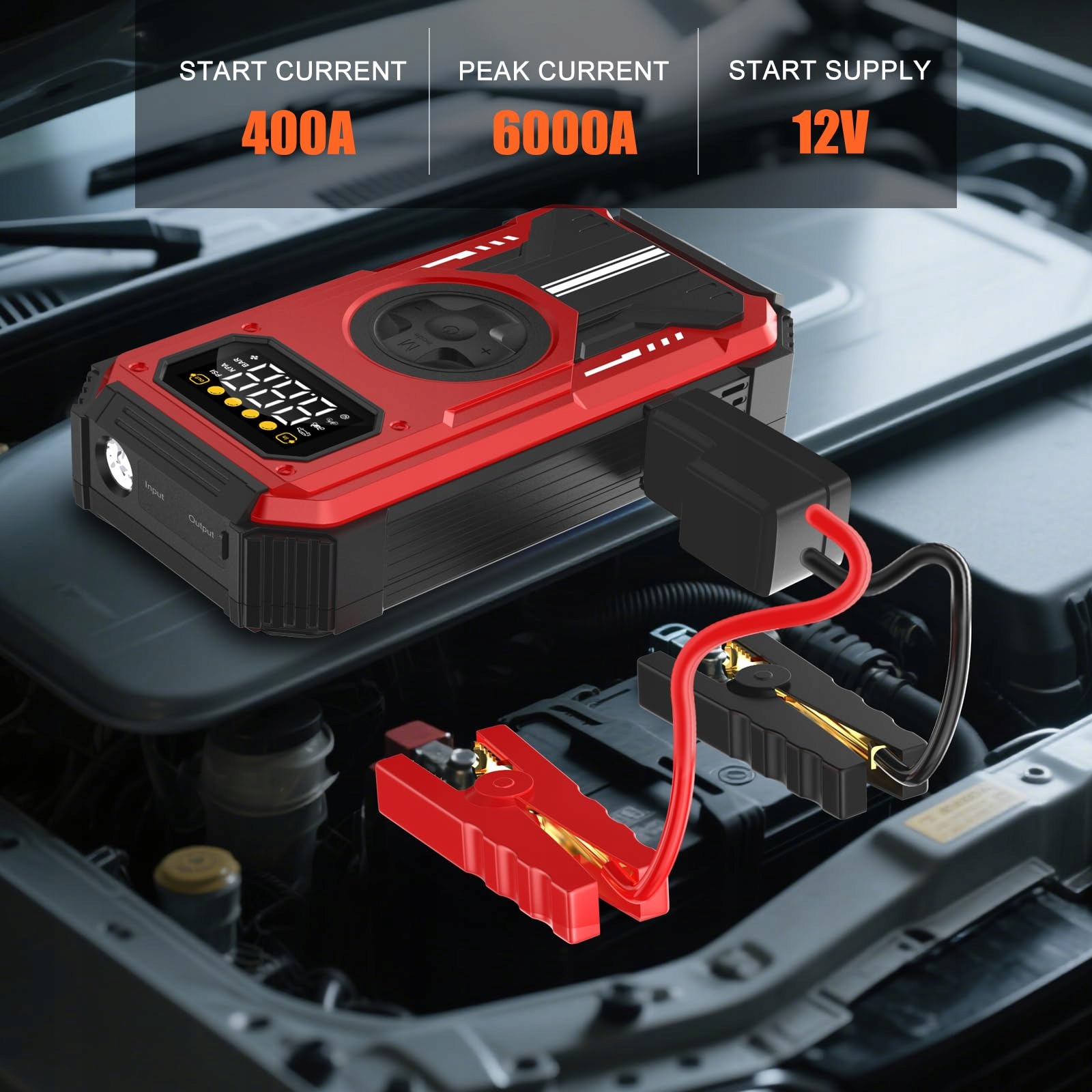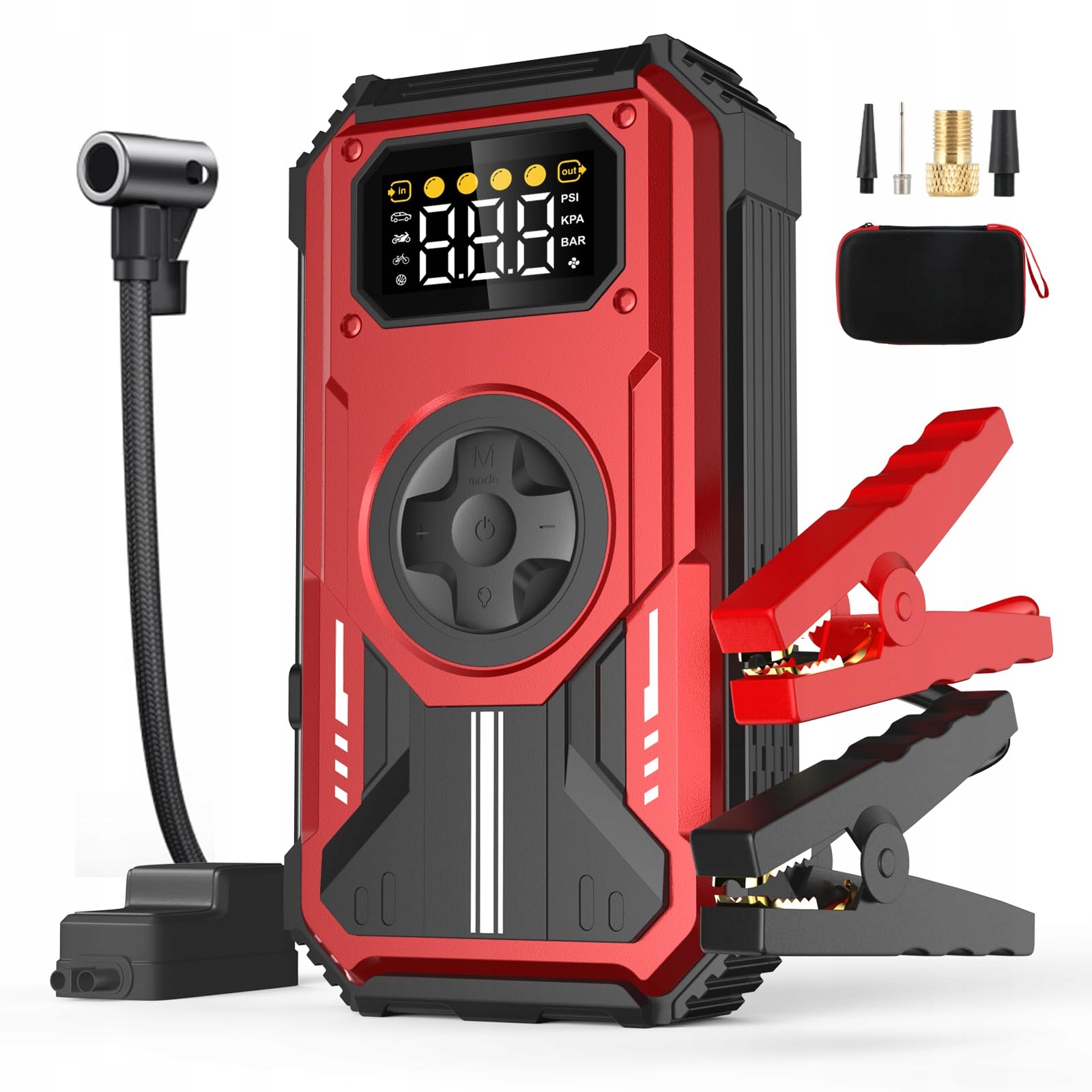 Eigotrav Powerbank rozruchowa do samochodu osobowego, booster rozruchowy 6000A (do 7,5L benzyny, 6L diesla), rozruch 12V z kompresorem 150 PSI, latarka LED, wyświetlacz LCD, czerwony