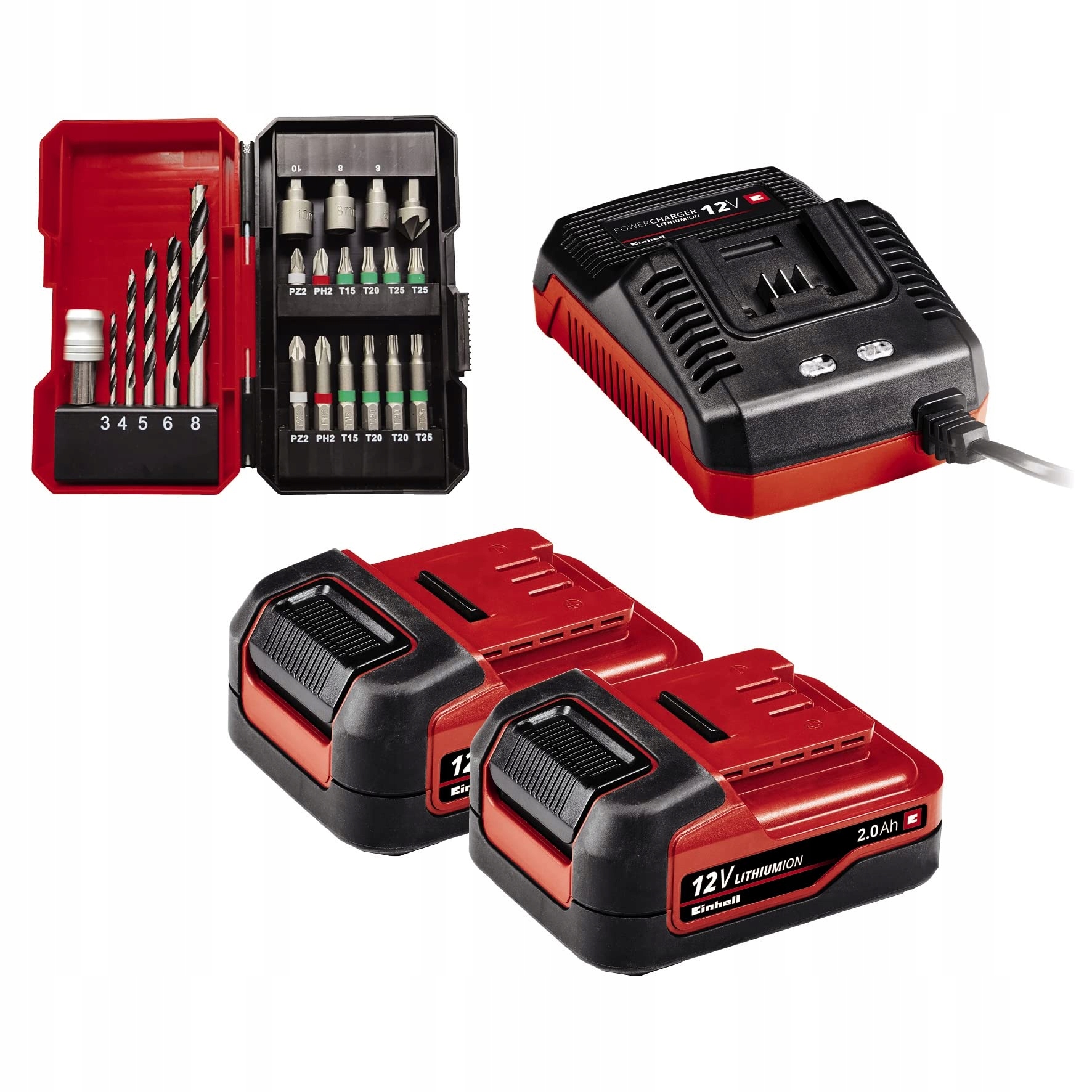 Zestaw wieloczęściowy - W zestawie znajdują się dwa akumulatory 2,0 Ah, ładowarka, 22-częściowy zestaw bitów i wierteł oraz lampa akumulatorowa o jasności 100 lumenów.