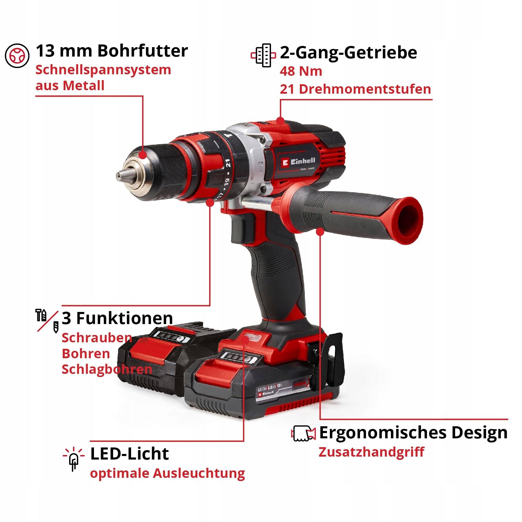 Einhell Akumulatorowa wiertarko-wkrętarka udarowa TE-CD 18/48 Li-i Kit Power X-Change (18 V, 48 Nm, funkcja udaru, uchwyt wiertarski 13 mm, 2 biegi, walizka, w tym 2x 2,0 Ah akumulatory + ładowarka)