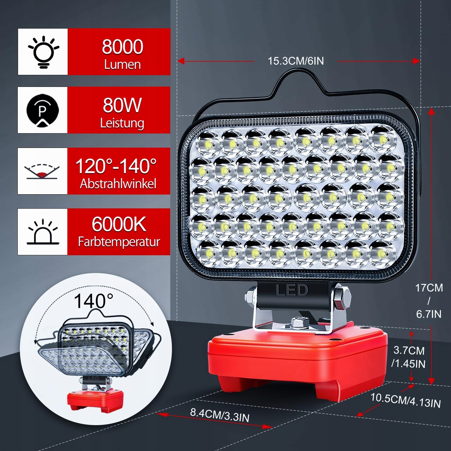 【Superjasne światło robocze LED】 Ta ulepszona bezprzewodowa lampa robocza posiada 42 diody LED, ultrawysoką jasność 80W i dwa tryby regulacji jasności: niska jasność 4000 LM, wysoka jasność 8000 LM oraz duża powierzchnia oświetlenia. Obrotowa o 140° głowica lampy pozwala precyzyjnie skierować światło na obszar pracy zgodnie z potrzebami.