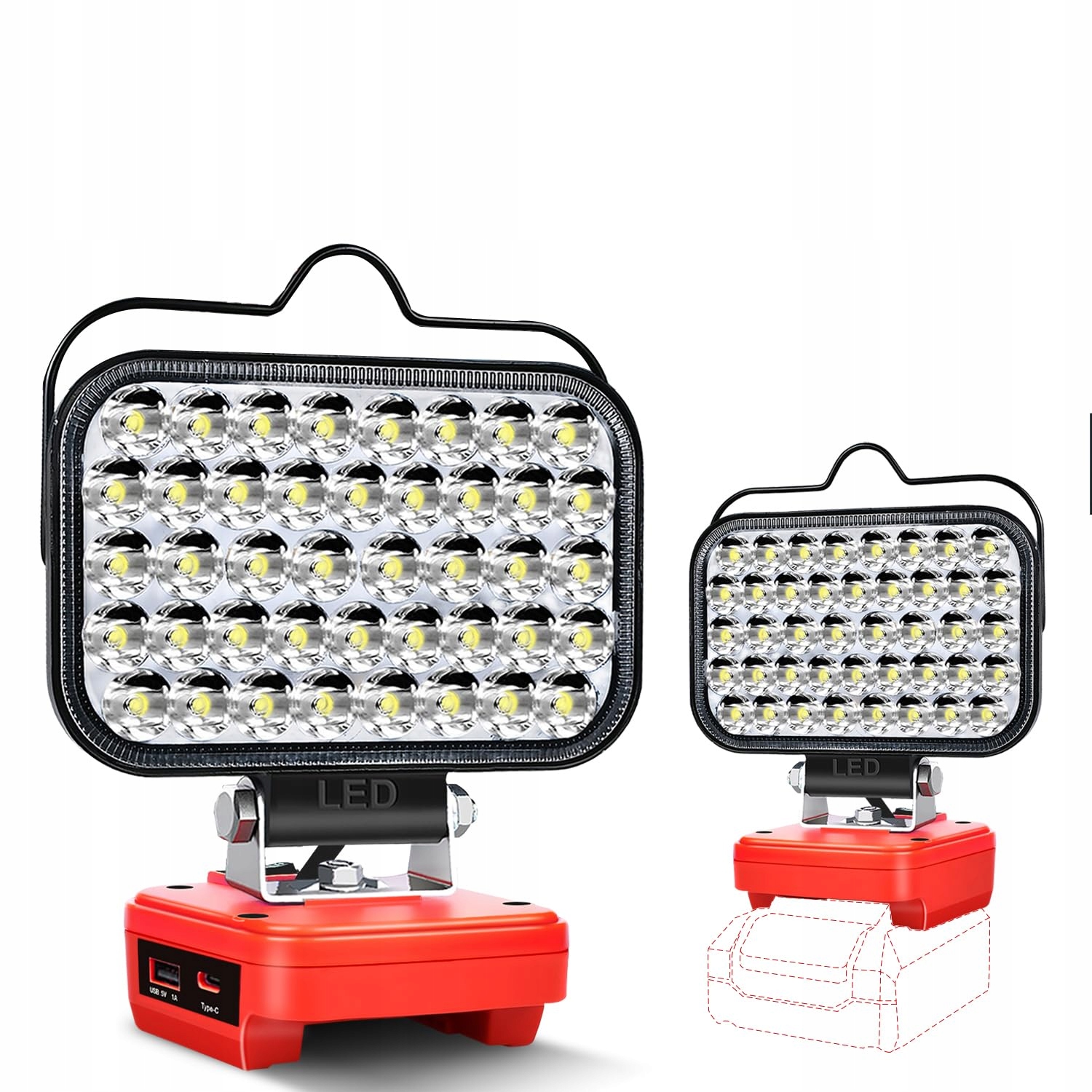 【Dwa porty ładowania】 Lampa robocza na akumulator z dwoma portami ładowania, port USB i port typu C. Dzięki szybkiemu ładowaniu można jednocześnie zasilać dwa urządzenia, co odpowiada mobilnemu power bankowi i lampie. Mocna