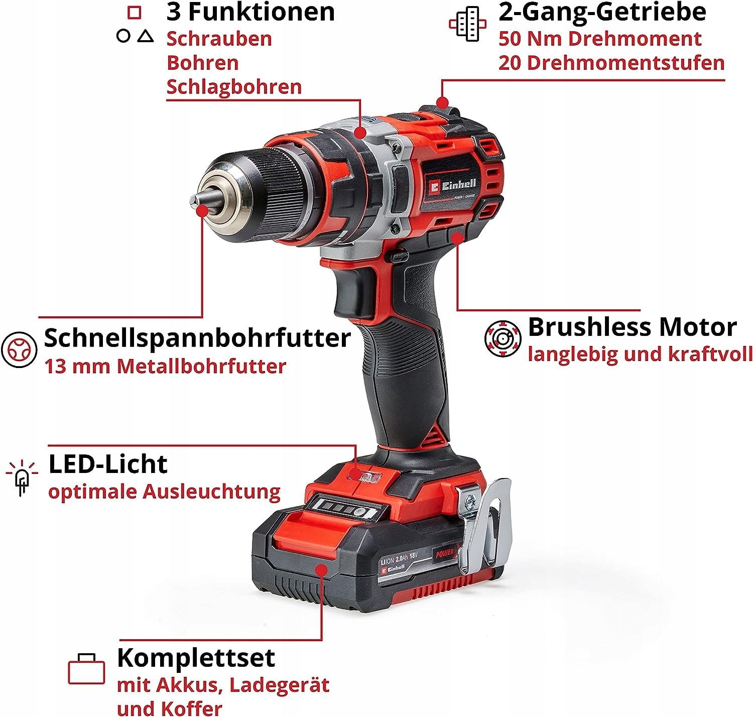 Akumulatorowy wiertarko-wkrętarka Einhell Professional TP-CD 18/50 Li-i BL Kit Power X-Change (18 V, bezszczotkowy, 50 Nm, funkcja udaru, w tym 2x 2,0 Ah akumulatory + ładowarka)