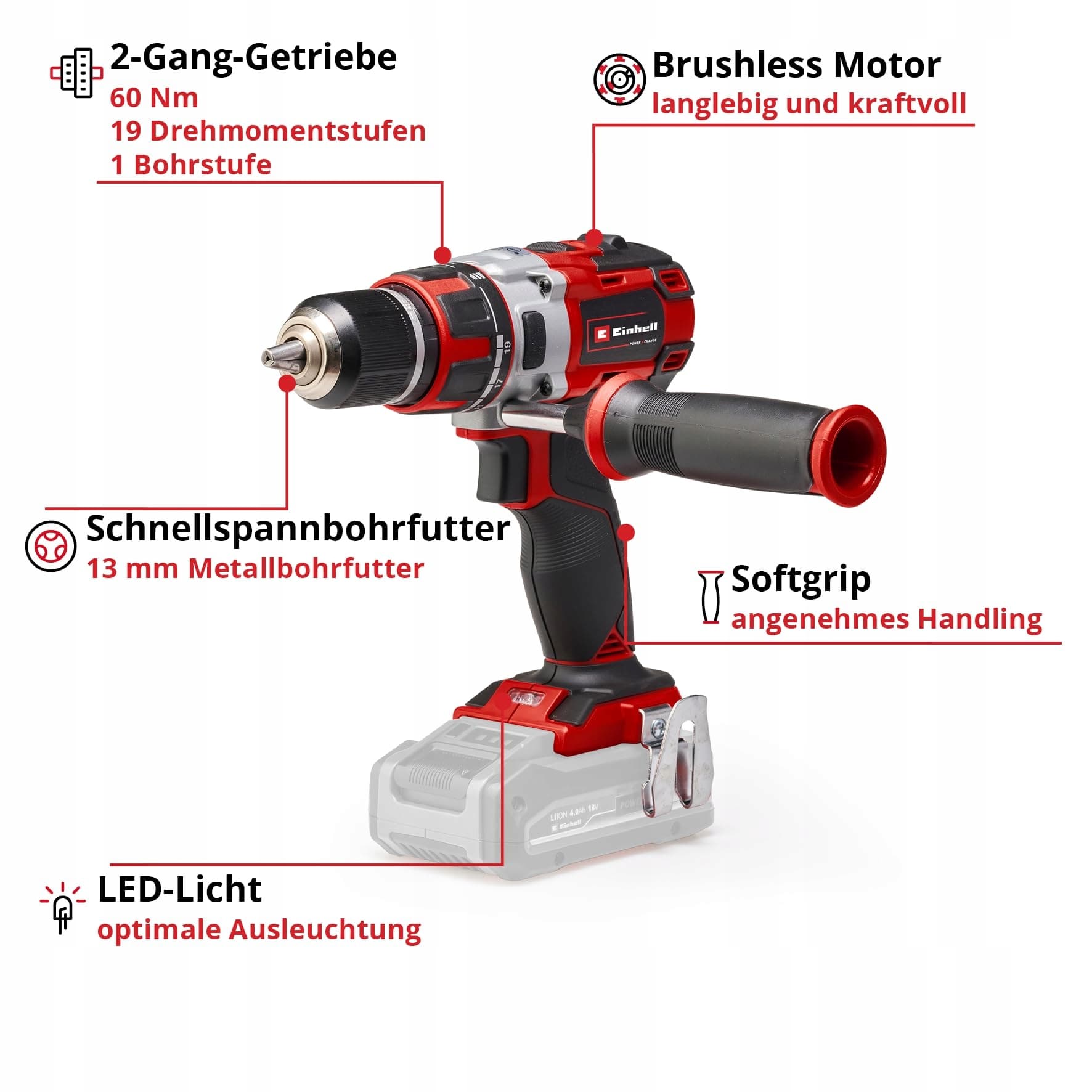 Einhell Professional Wkrętarka akumulatorowa TP-CD 18 Li Brushless Solo Power X-Change (Li-Ion, Czerwony, 18 V, 2 biegi, 60Nm/Bezszczotkowy/bez akumulatora, światło LED i ładowarka)