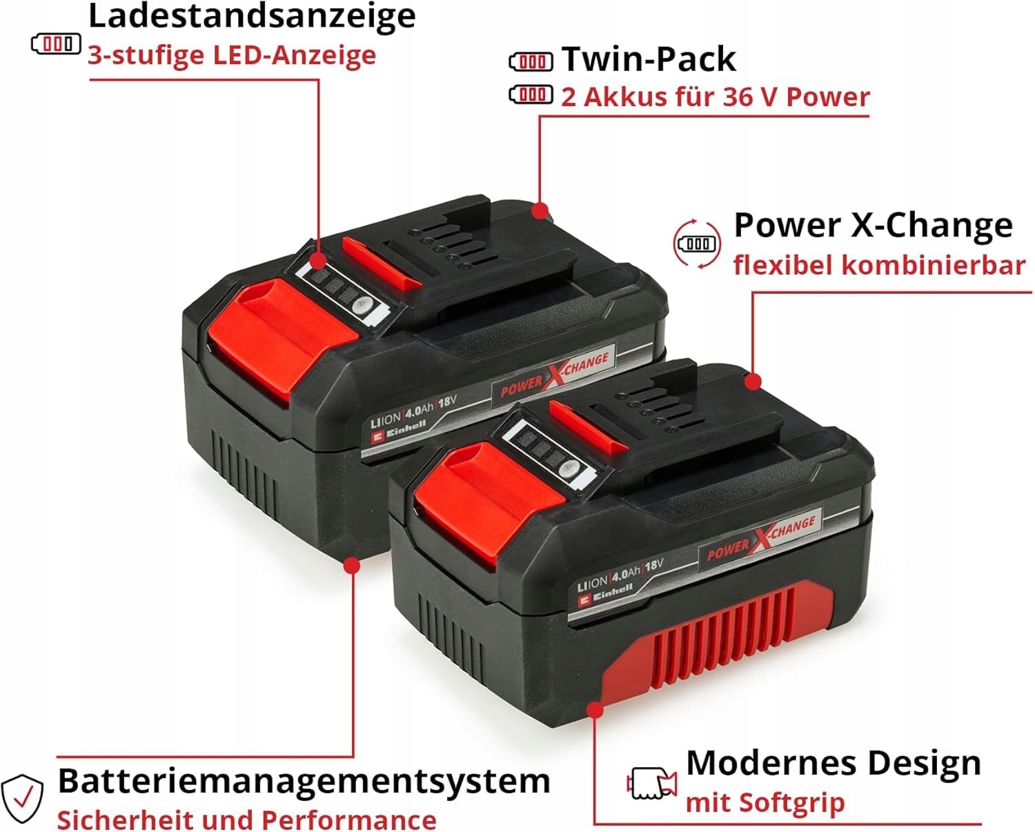 Einhell PXC-Batterie-Twinpack 4,0 Ah składa się z dwóch uniwersalnych akumulatorów 18 V z serii Power X-Change i oferuje podwójną moc dla wszystkich urządzeń z innowacyjnej serii systemowej.