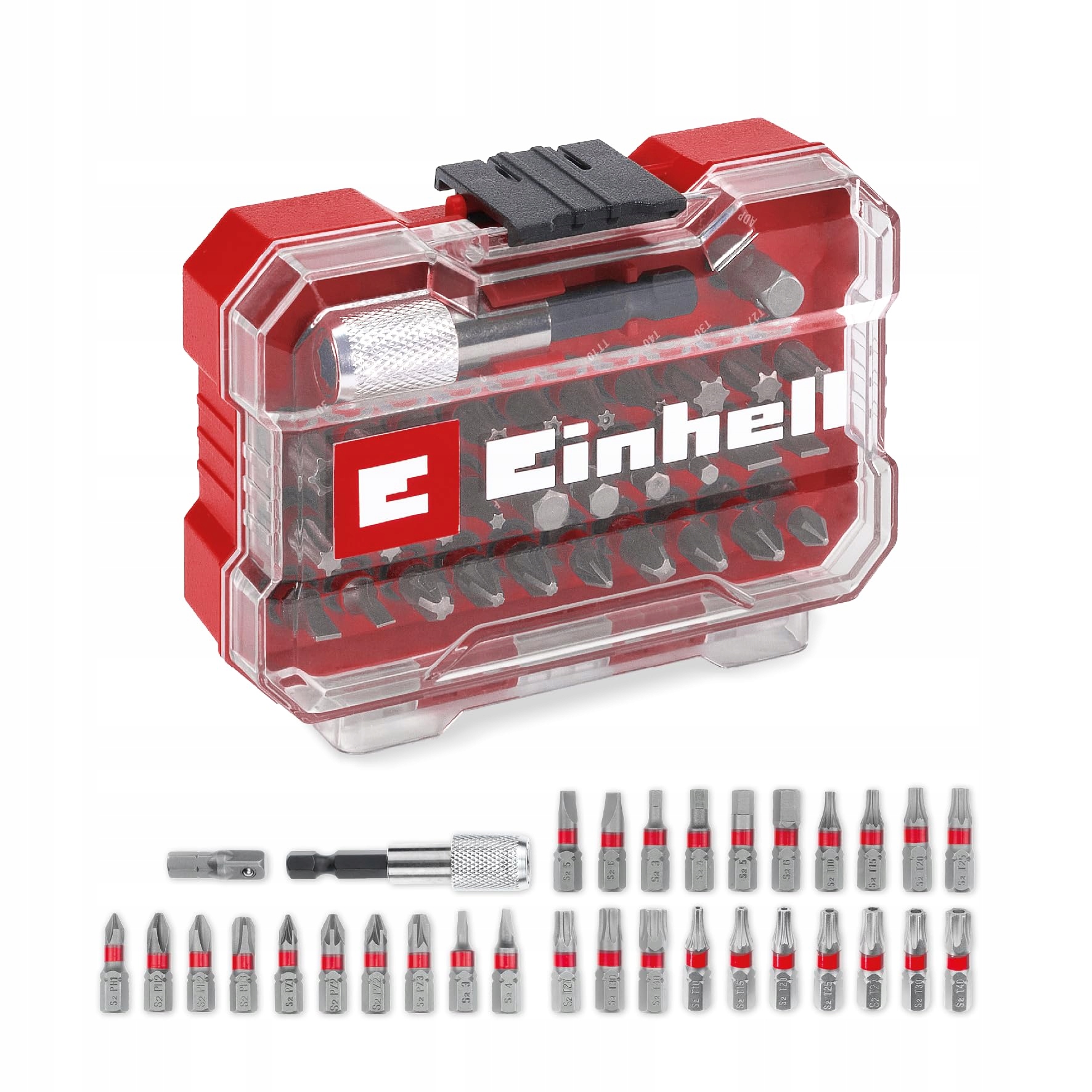 Oryginalny zestaw bitów Einhell XS-CASE 32-częściowy (bity 25 mm, uchwyt do szybkiej wymiany 60 mm, adapter z Hex na 1/4' napęd włącznie z pudełkiem do przechowywania)