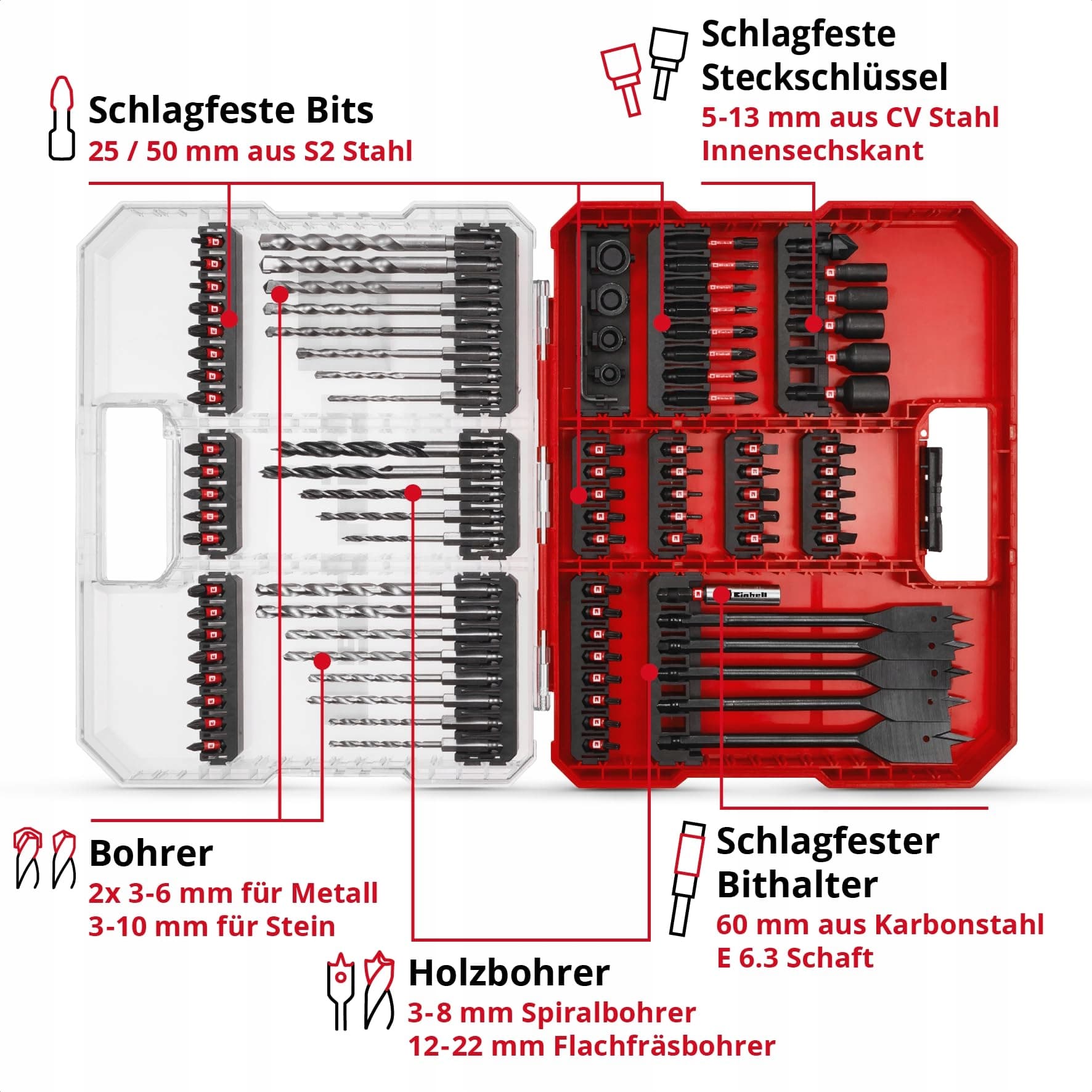 Oryginalny zestaw wierteł i bitów Einhell XL-CASE 95 szt. odporny na uderzenia (bity, różne wiertła, uchwyty na bity, klucze nasadowe, wkrętaki, ograniczniki wiertła, klucze do pinów w tym pudełko do przechowywania)