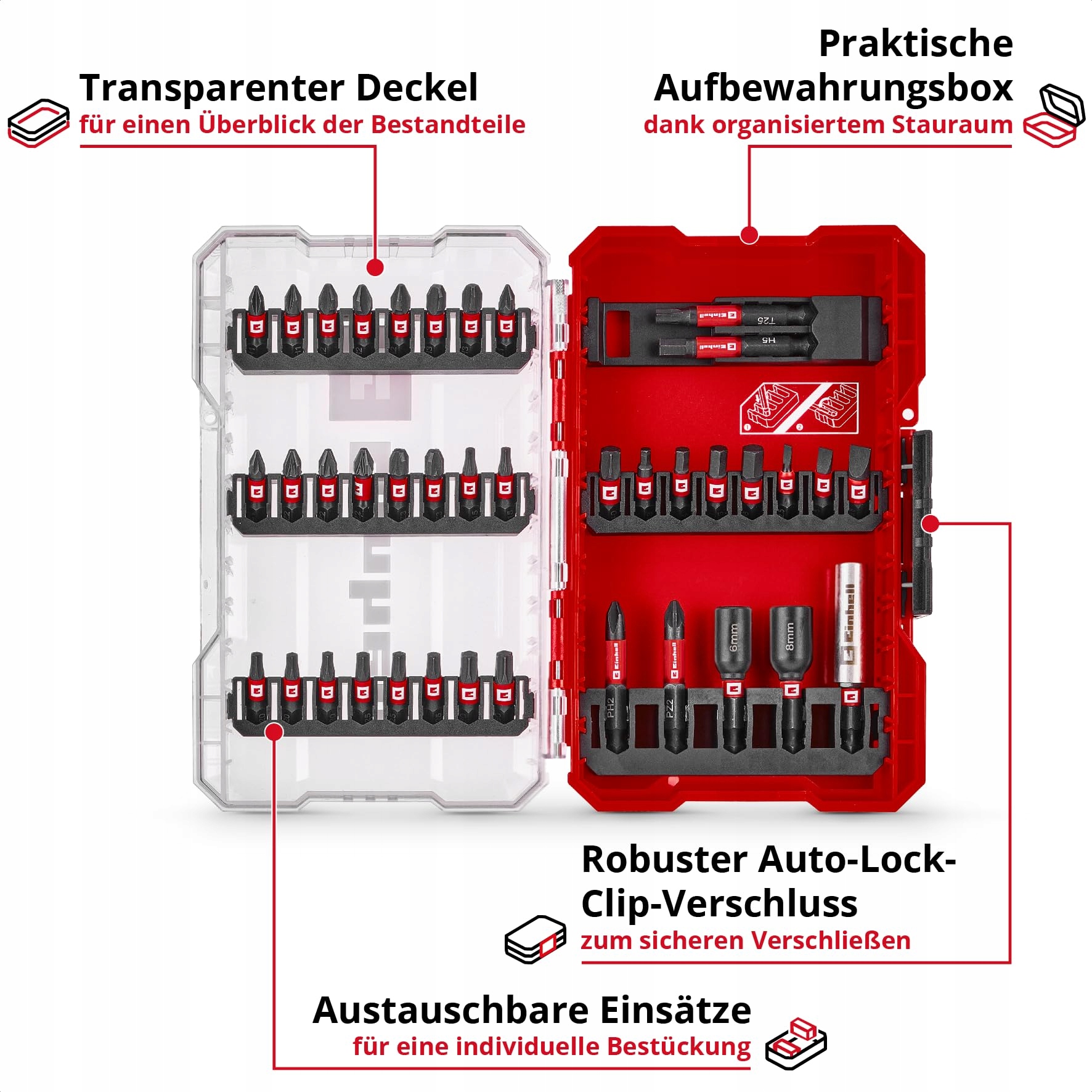 Wymienne wkłady – Dzięki wymiennym wkładom zorganizowanego zestawu bitów Einhell, możliwe jest dostosowanie wyposażenia w zależności od potrzeb.