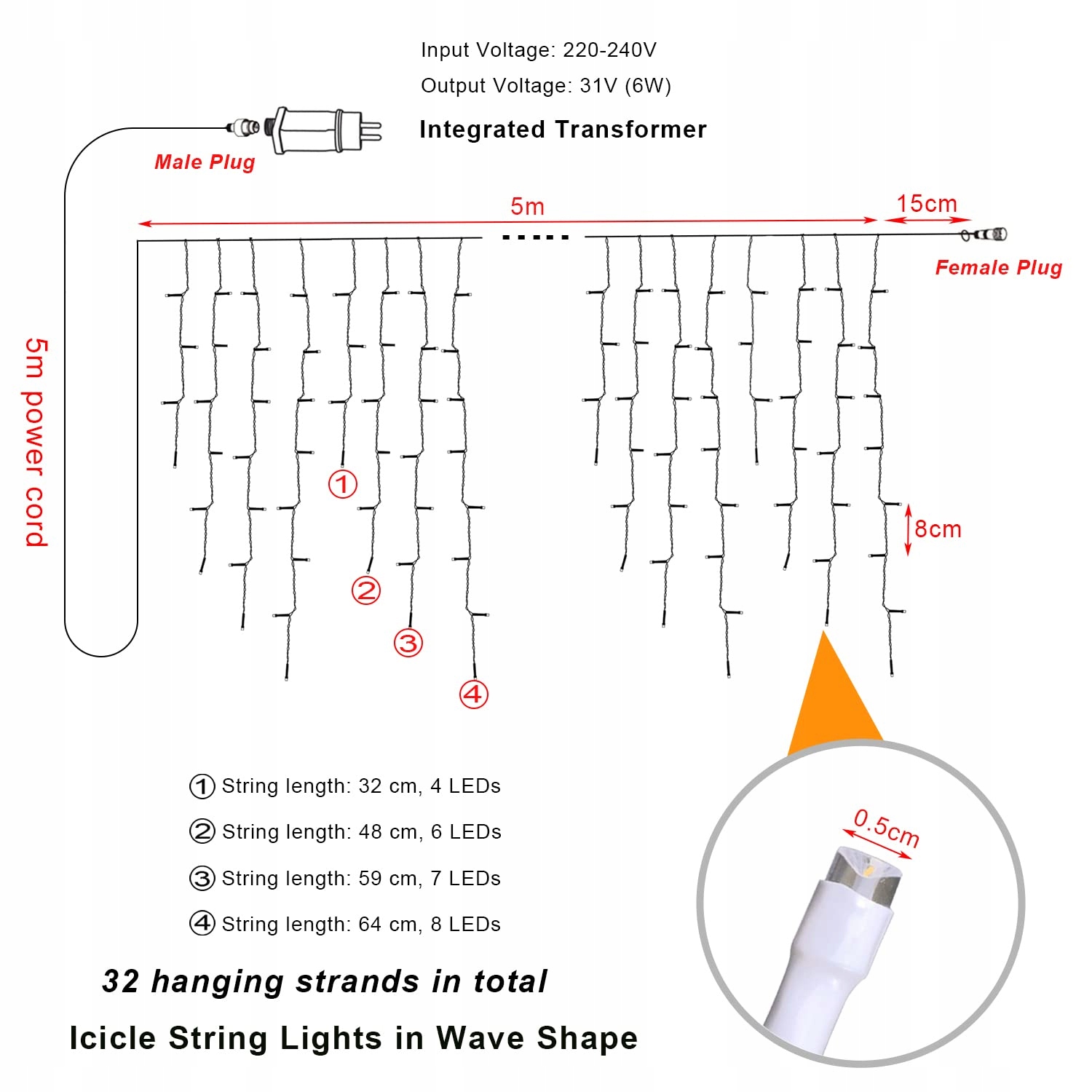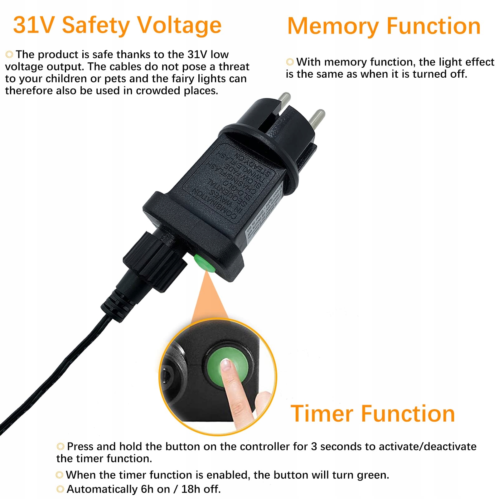 Napięcie wyjściowe z timerem: 31V napięcie wyjściowe wtyczka EU, brak ryzyka porażenia prądem, bezpieczne w użyciu. Wtyczka jest wyposażona w funkcję timera 6/18 godzin. Przytrzymaj przycisk na wtyczce przez 3 sekundy. Po zaświeceniu się zielonego przycisku funkcja timera jest aktywowana. Wyłącza się automatycznie po 6 godzinach i włącza automatycznie po 18 godzinach.