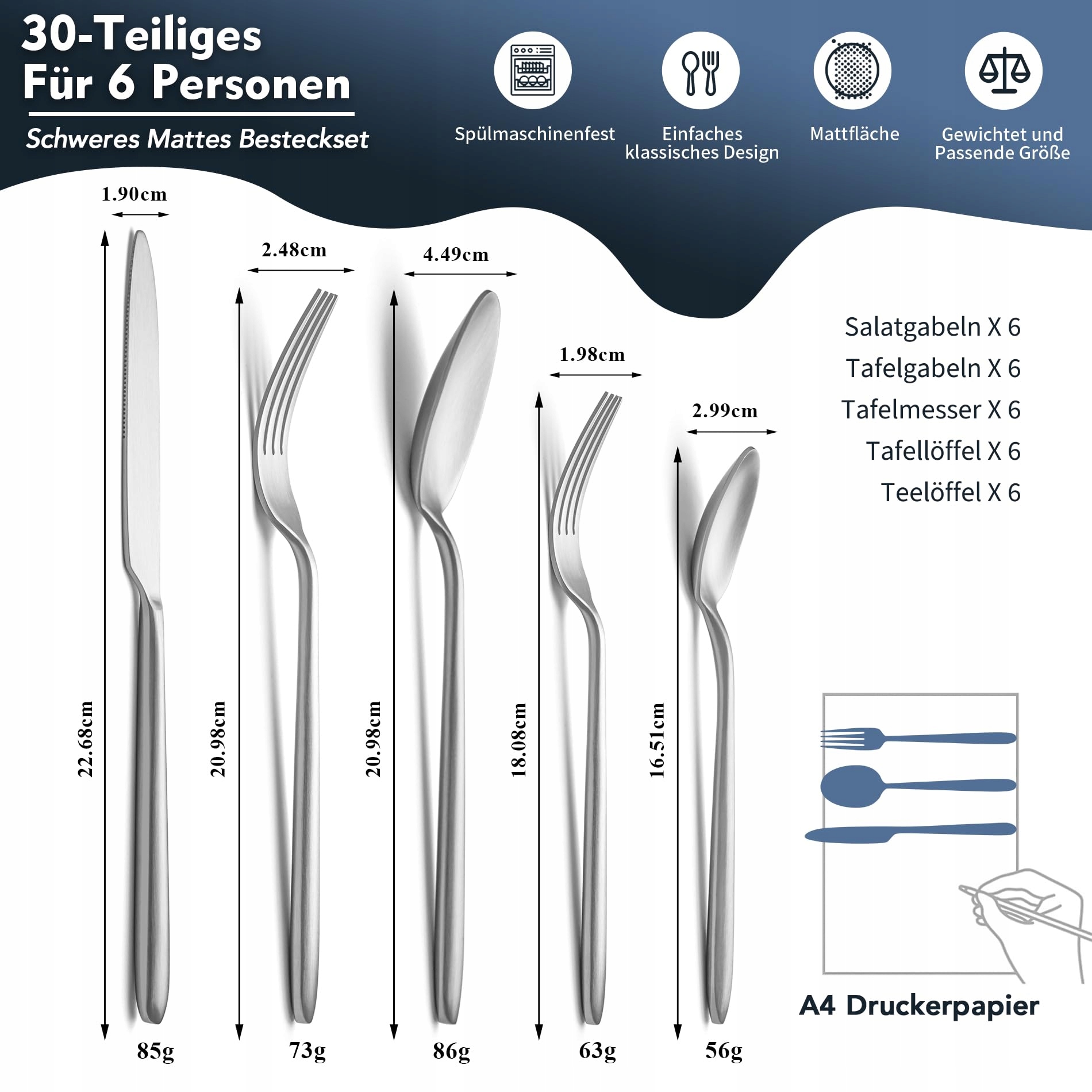 【30-częściowy zestaw sztućców dla 6 osób】30-częściowy matowy zestaw sztućców składający się z 6 noży do potraw, 6 widelców do potraw, 6 łyżek do potraw, 6 widelczyków do deserów, 6 łyżeczek. Zestaw naczyń dla 6 osób oferuje wszystko, czego potrzebujesz na idealną kolację. Ten srebrny zestaw sztućców jest elegancki i okazały w wyglądzie i jest dobrym wyborem dla każdej rodziny