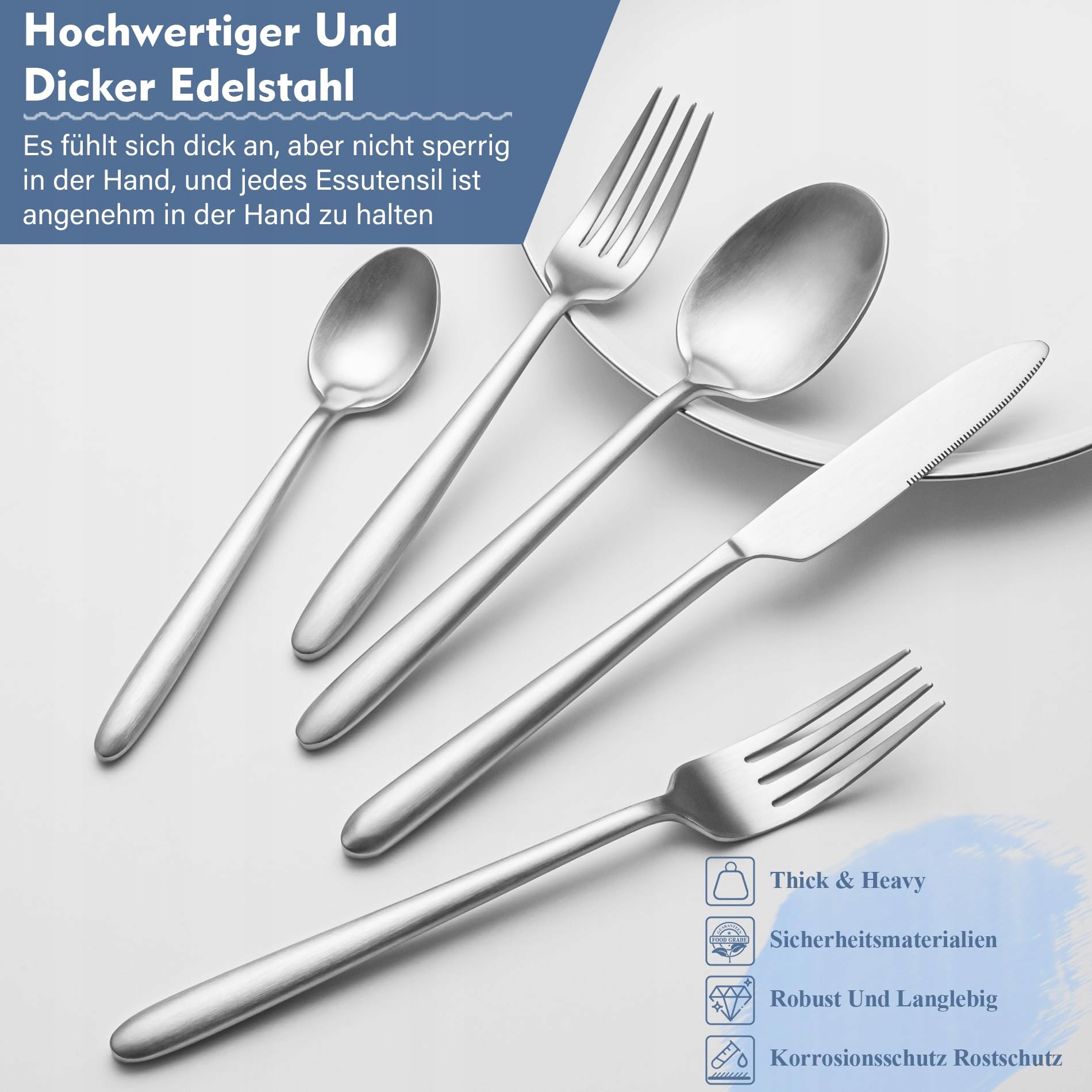 【Premium ciężki zestaw sztućców z grubego stali nierdzewnej】EIUBUIE ciężkie sztućce są kute z jednego kawałka grubego, wysokiej jakości stali nierdzewnej, 1,5 razy cięższe niż zwykłe sztućce, gruba konstrukcja nie będzie się wyginać ani łamać po intensywnym użytkowaniu, zapewnia doskonałą odporność na rdzę, korozję i kwasy, aby zapewnić najtrwalsze i najzdrowsze doświadczenie użytkowania