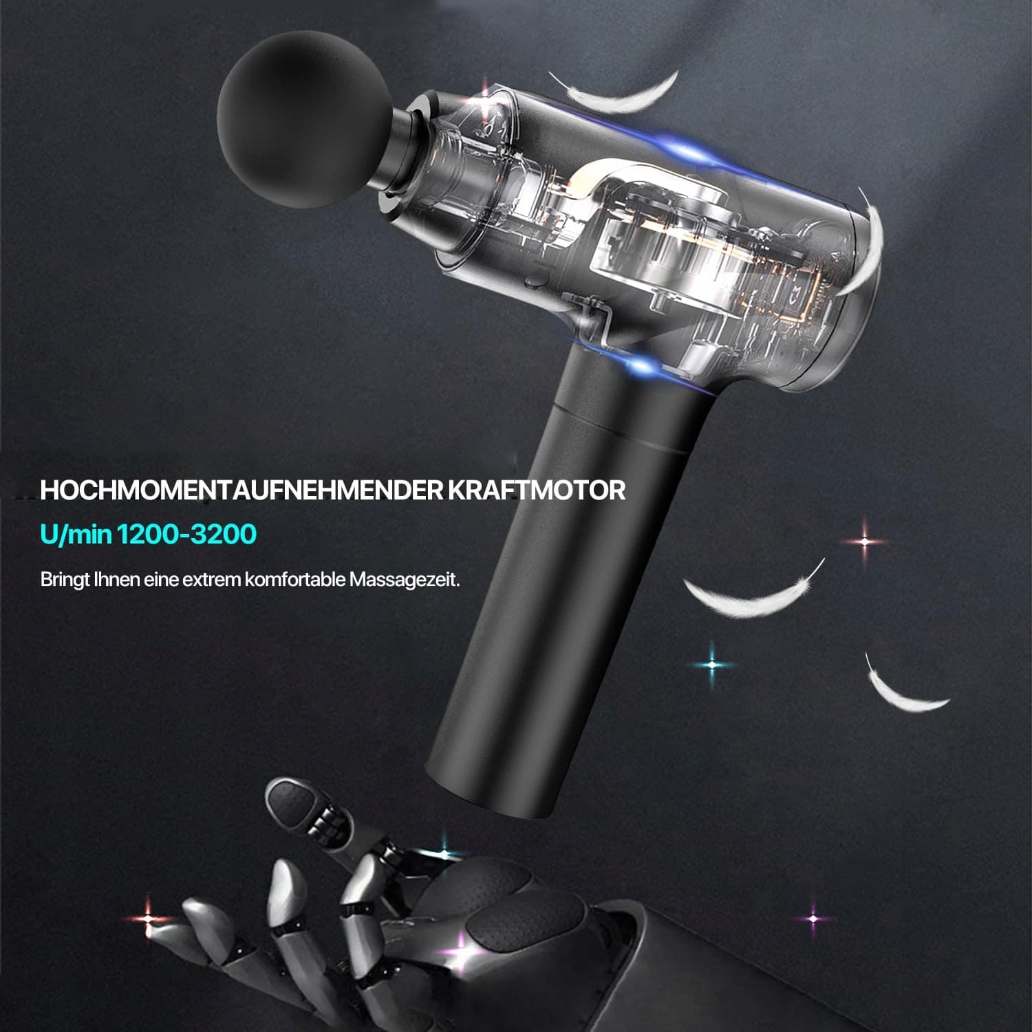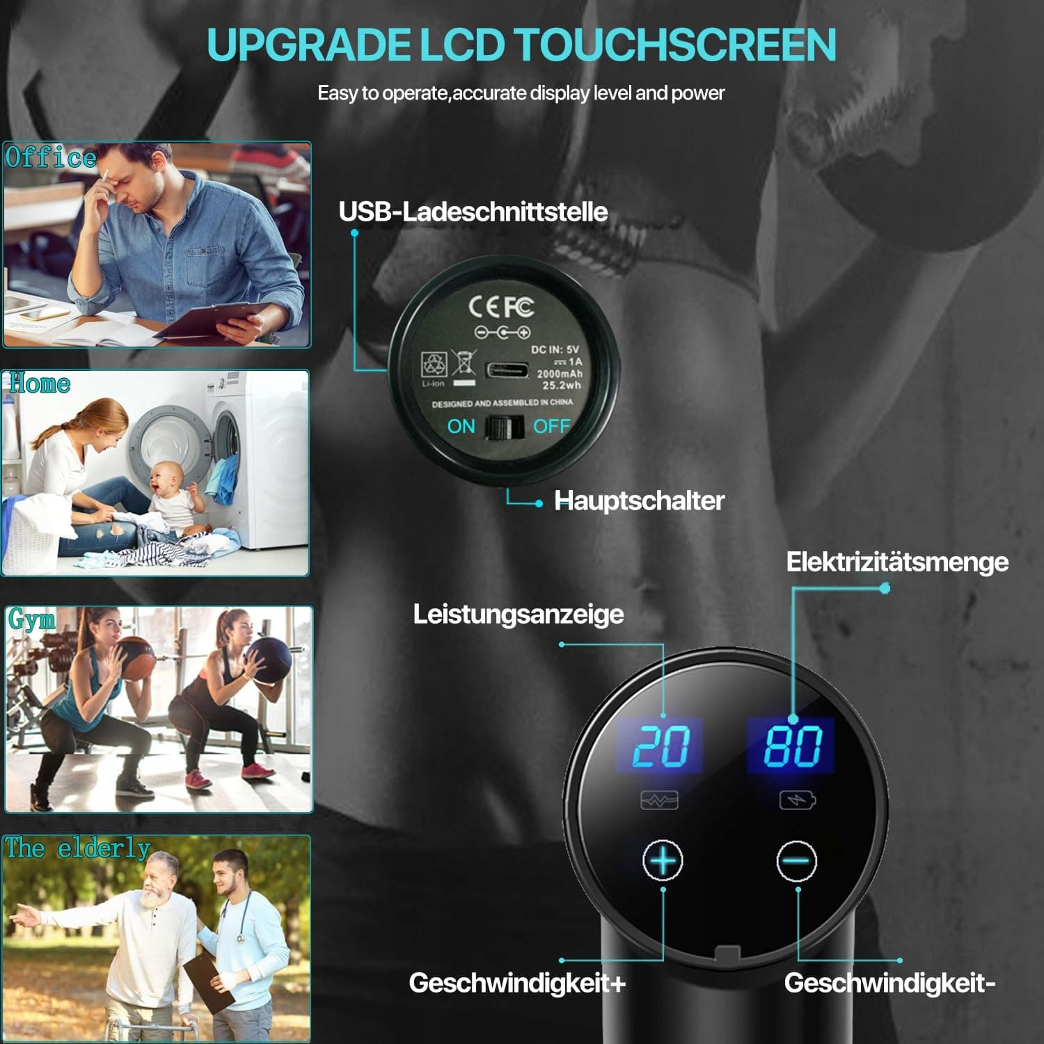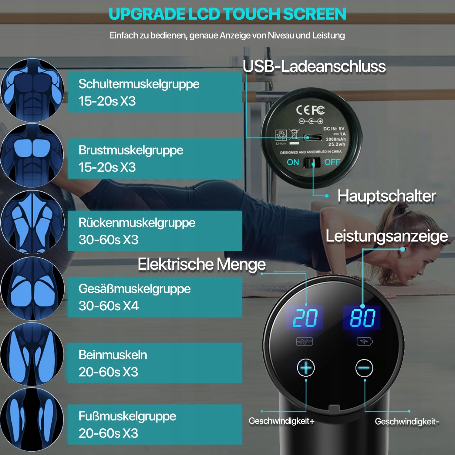 [20 poziomów LCD z ekranem dotykowym] Częstotliwość może być dostosowywana w zależności od różnych części ciała, które są masowane. Mocny silnik generuje 1200-3200 uderzeń na minutę. Użytkownik może zmieniać prędkość urządzenia do masażu w zależności od potrzeb, aby zapewnić relaksujący masaż dla każdej grupy mięśniowej.