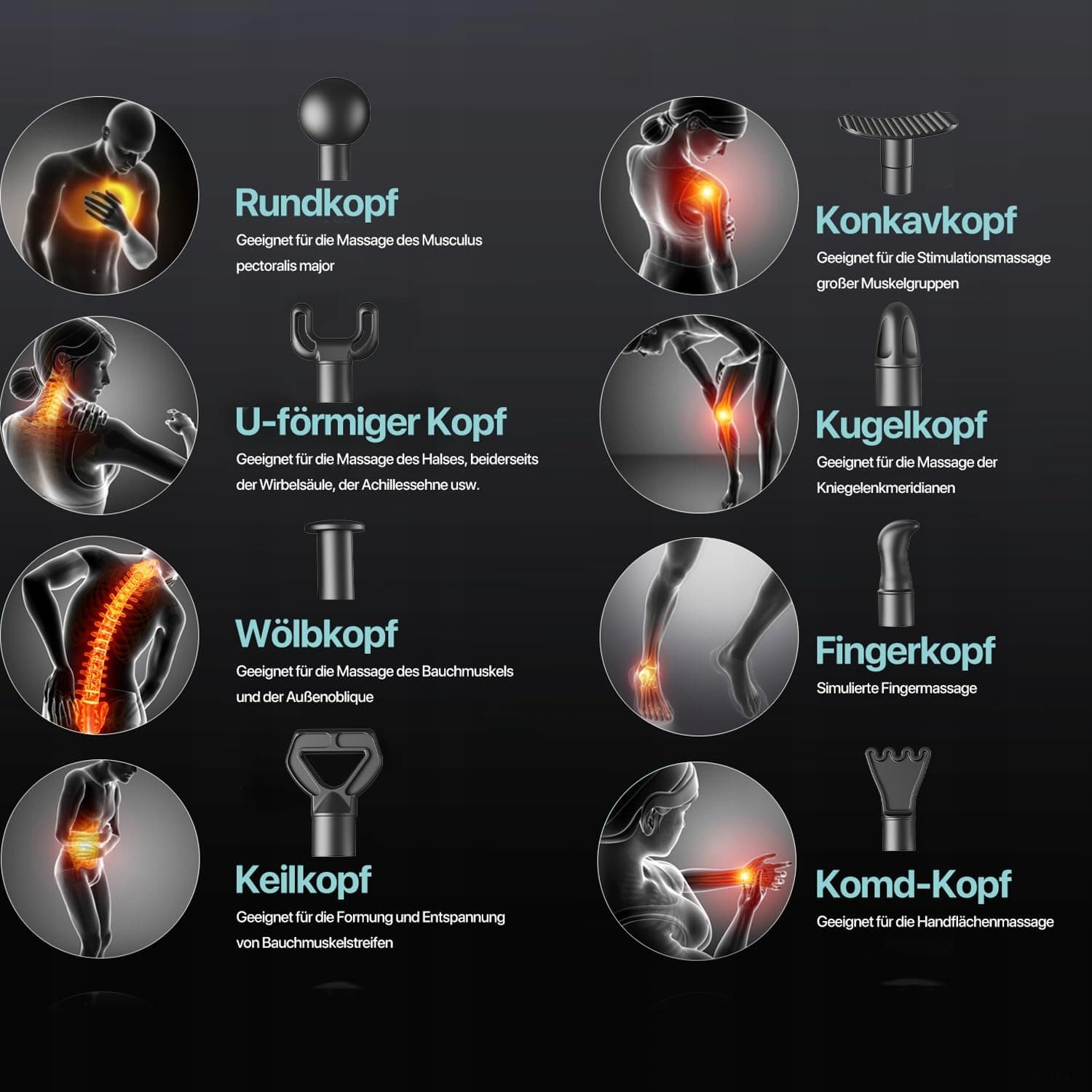 [Wielofunkcyjne urządzenie do masażu] Urządzenie do masażu głębokiego tkanki ma 8 różnych głowic masujących, które celują w różne mięśnie. Po uderzeniu urządzenia w mięśnie, może ono wspomagać krążenie, rozkładać kwas mlekowy i łagodzić ból mięśni po treningu. Ponadto urządzenie do masażu jest dostarczane z przenośną torbą, co ułatwia relaksację mięśni w dowolnym miejscu i czasie.