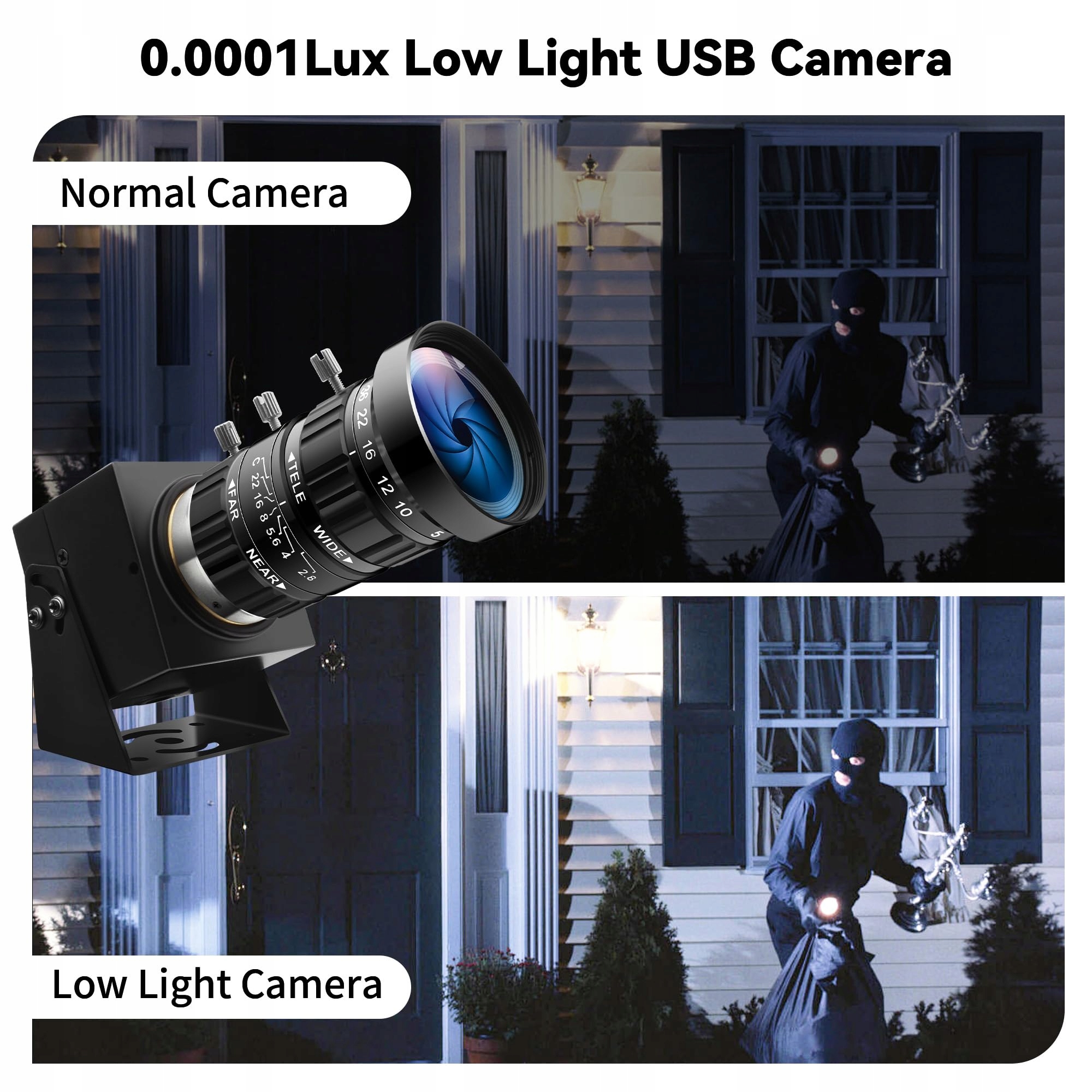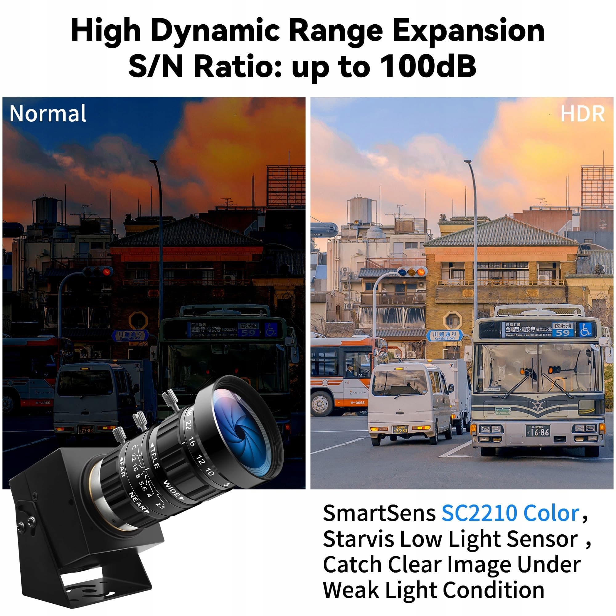 Ultralekka kolorowa widoczność nocna: Kamera USB Starvis o czułości światła 0,0001 Lux i wysokiej jakości sensorze 1/1,8'' SmartSens SC2210 dostarcza wyraźne kolorowe obrazy nawet przy niemal całkowitej ciemności. Idealna do monitoringu nocnego, przemysłowych środowisk o słabym oświetleniu i wielu innych zastosowań, unikając rozmytych czarno-białych obrazów.