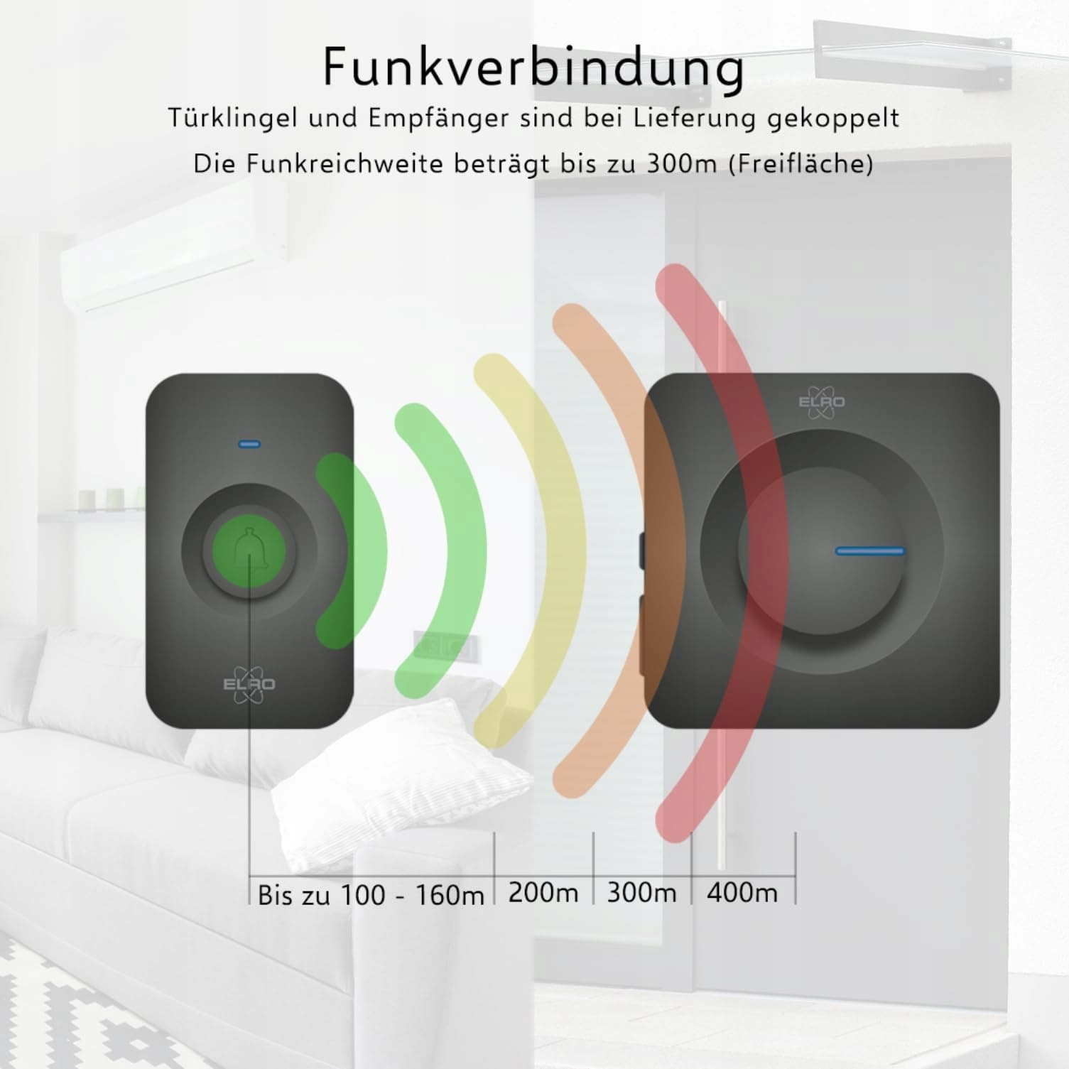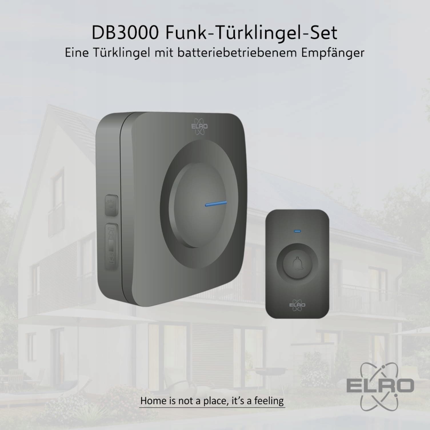 ELRO DB3000 Zestaw dzwonków bezprzewodowych 2X przenośny odbiornik z baterią-wodoodporny, zasięg 300m, 64 melodie-czarny