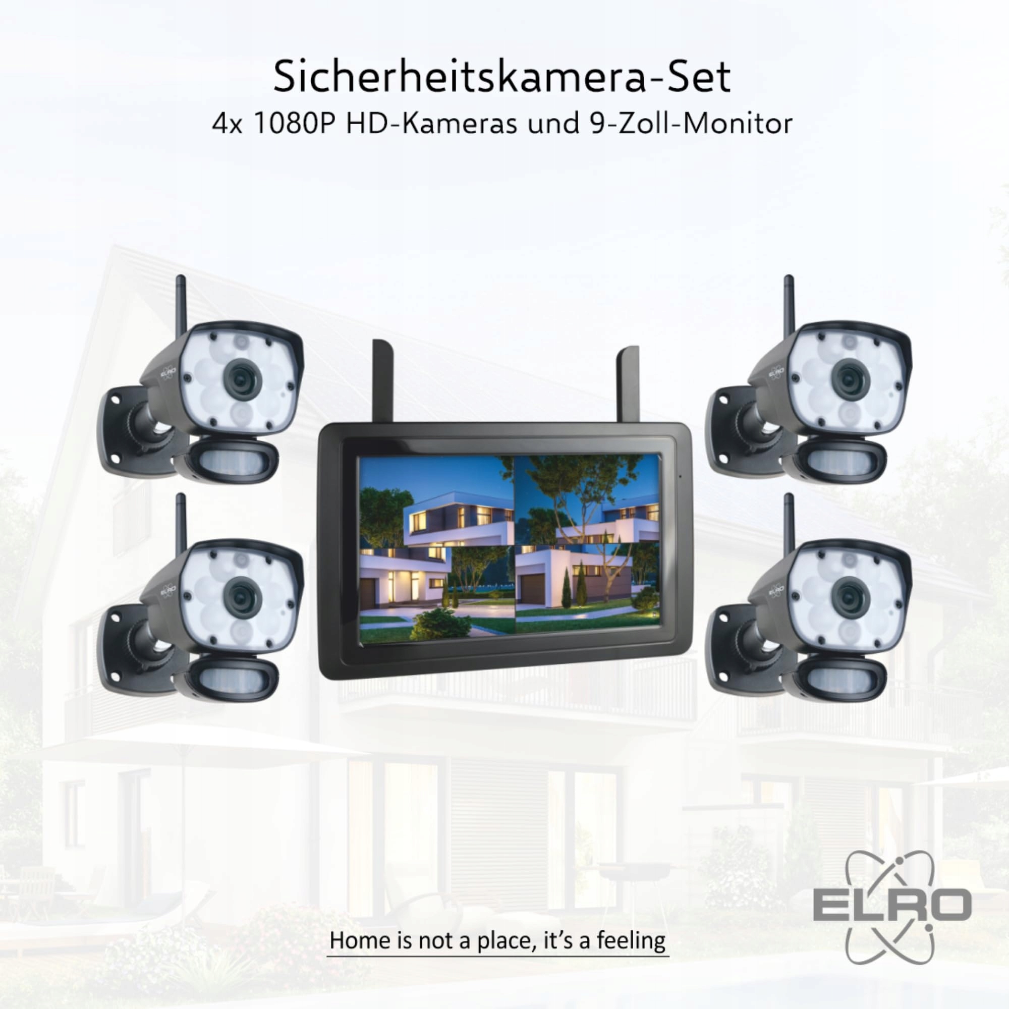 ELRO Zestaw Kamer Nocnych 1080P HD 4 Kamery 9 Calowy Ekran i Aplikacja