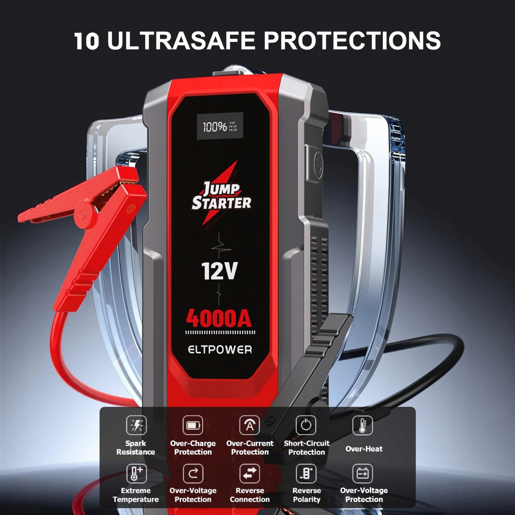 INTELIGENTNA OCHRONA BEZPIECZEŃSTWA: Nasze urządzenie rozruchowe posiada 10 różnych funkcji bezpieczeństwa. Zaawansowane inteligentne zaciski chronią przed zwarciami, przegrzaniem, przeładowaniem, nadmiernym rozładowaniem, odwrotną polaryzacją i innymi zagrożeniami, zapewniając ochronę dla Ciebie i Twojego pojazdu. Połączone z doskonałą przewodnością i wytrzymałymi zaciskami pod napięciem umożliwia szybki i bezpieczny rozruch rozładowanego akumulatora nawet w ekstremalnych warunkach od -20°C do 60°C.