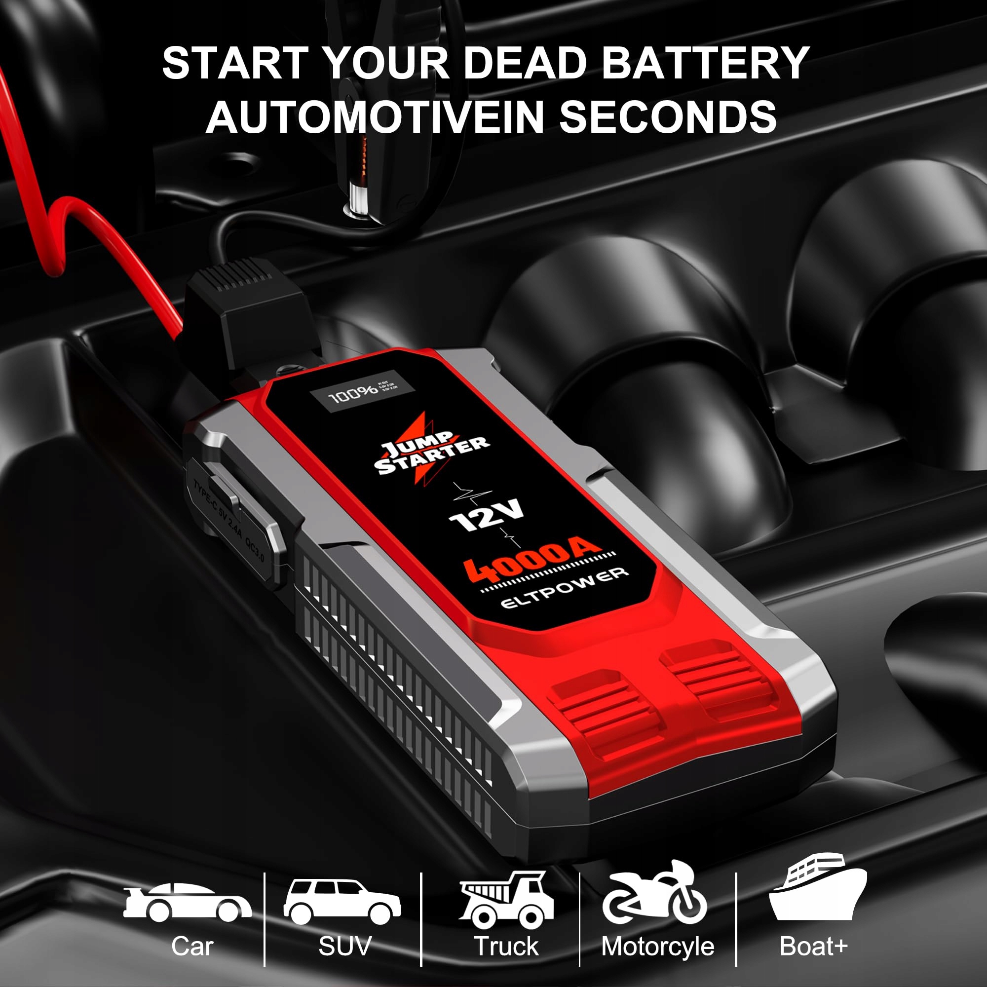 ELTPOWER Powerbank rozruchowa do samochodu 4000A UltraSafe Powerbank rozruchowa 12V Booster do samochodu z latarką LED Kabel rozruchowy Power Bank USB do samochodów osobowych, ciężarowych, UTV, vanów, motocykli
