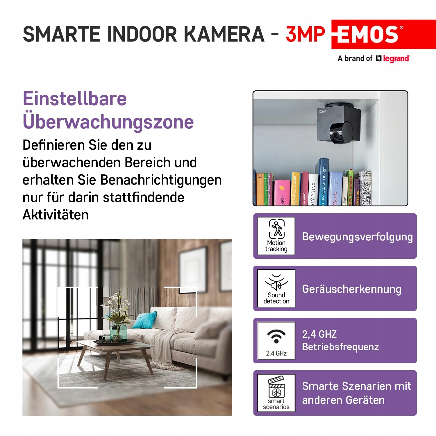 EMOS GoSmart - Smart Home Kamera do monitoringu wewnętrznego - 3MP Obracająca się kamera WLAN IP z aplikacją - Widzenie w nocy - pochylana i obracana - kompatybilna z Google Assistant i Alexa - czarna
