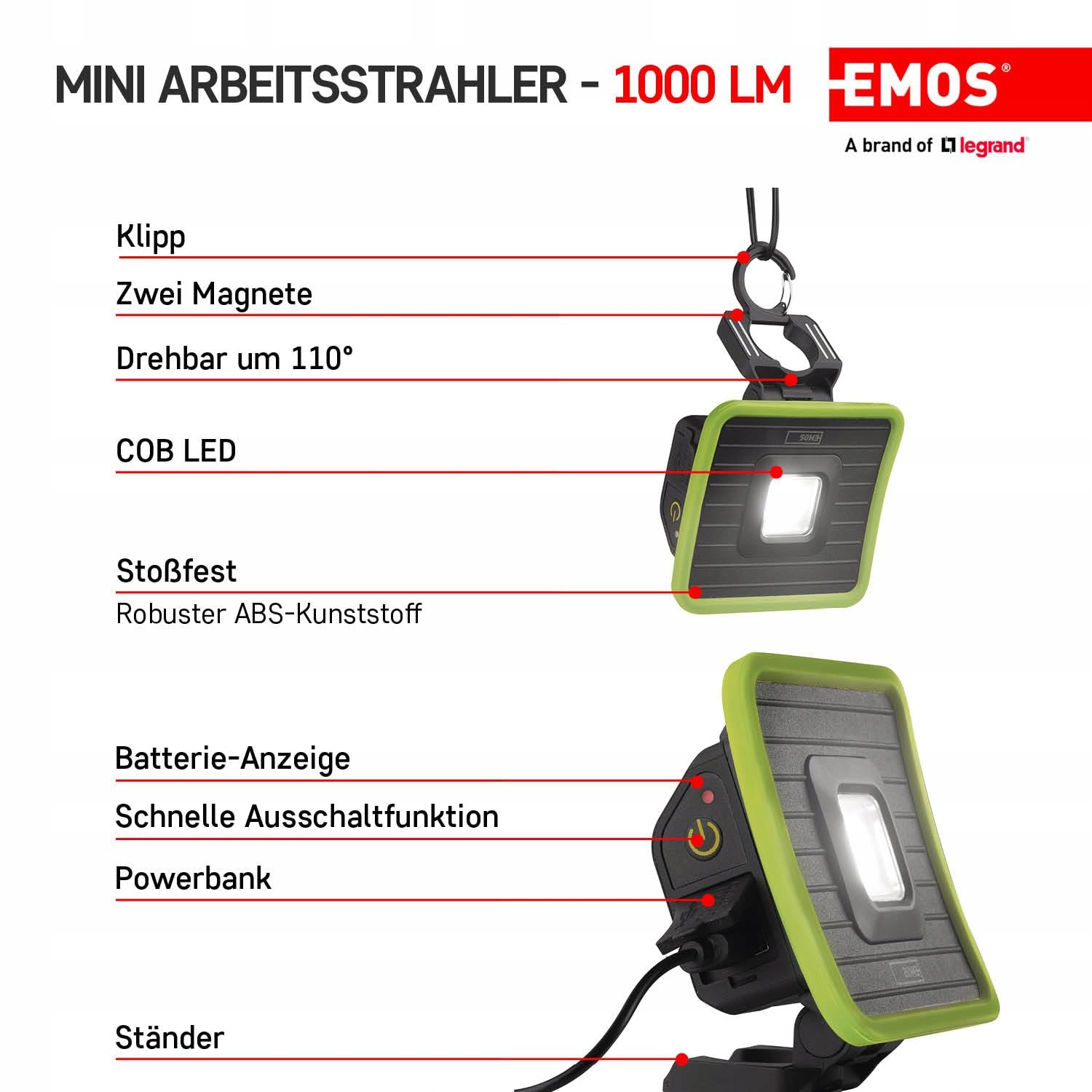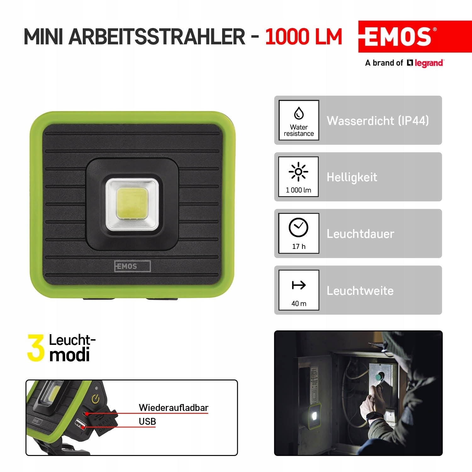 MAŁA I MOCNA: Uniwersalne światło robocze dzięki technologii COB-LED osiąga jasność do 1000lm i zasięg do 40m. Oferuje 3 różne tryby świecenia: COB LED 100%, COB LED 50%, COB LED 25%. (EMOS P4539)
