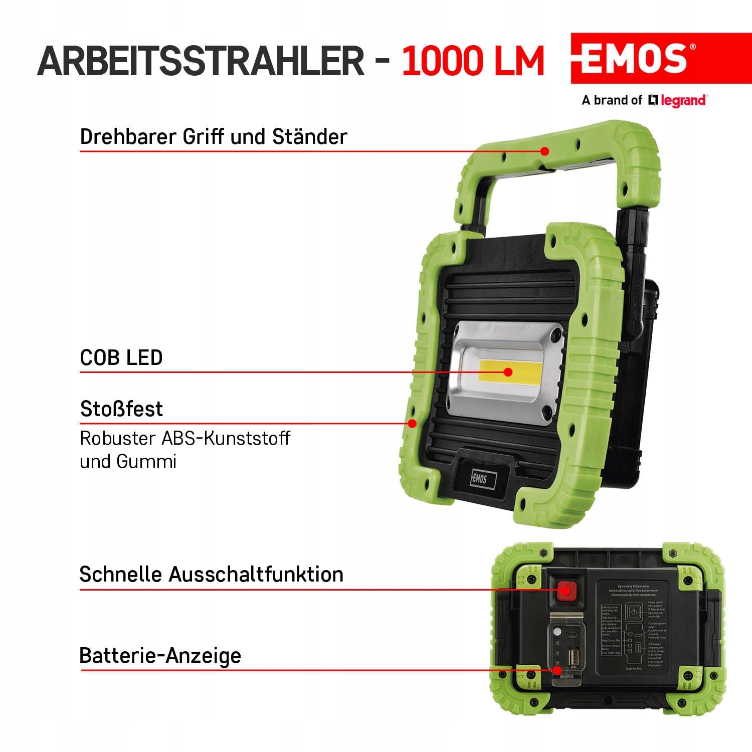 EMOS - ładowalna lampa robocza LED - odporna na uderzenia i wodoodporna - max. 1000lm, max. 45 m - 3 tryby świecenia - 15,5 godziny - kabel micro-USB - IP44 do użytku na zewnątrz - czarno-zielona