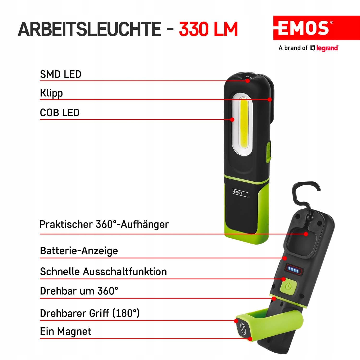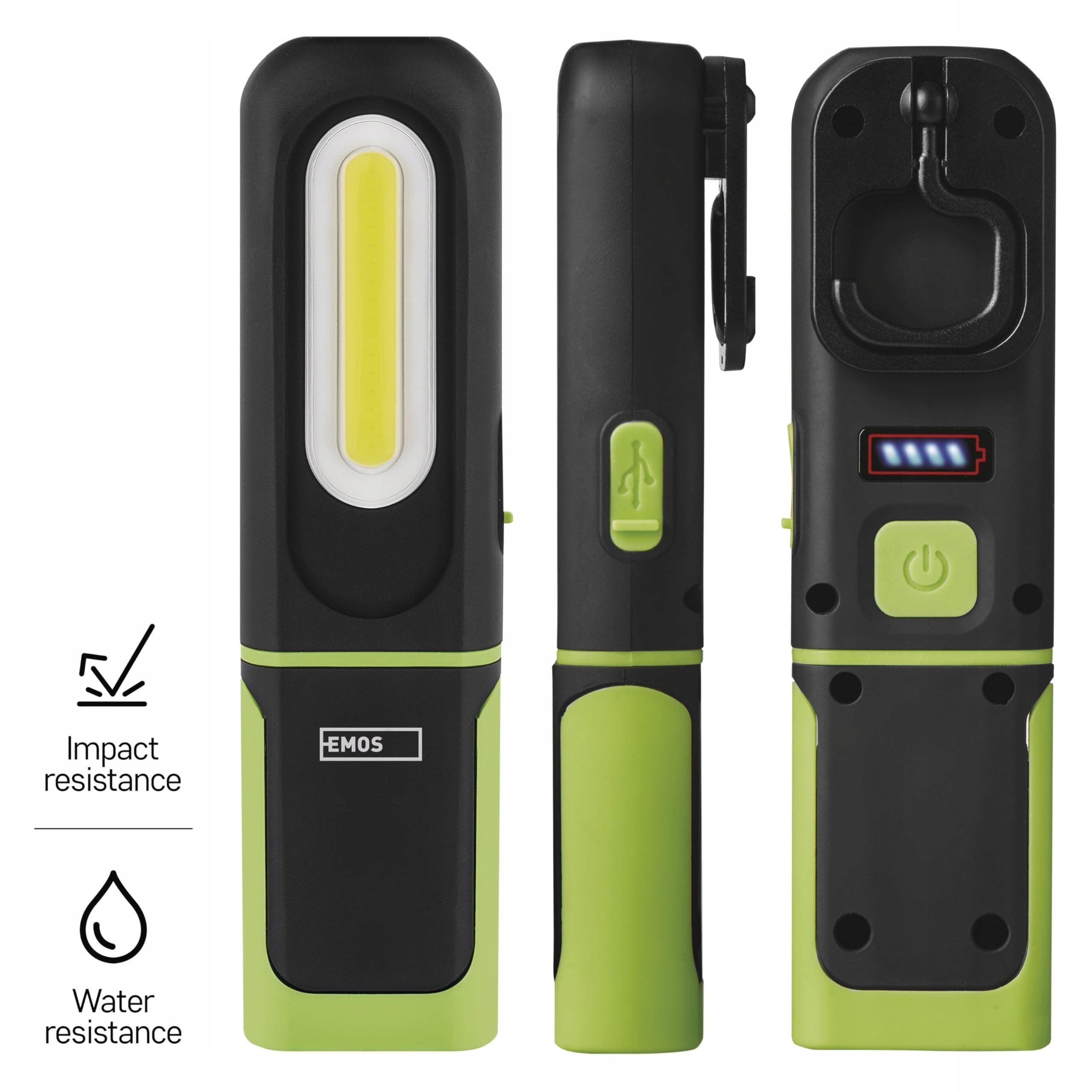 EMOS - ładowalna lampa robocza LED - magnes, hak, regulowana - odporna na wstrząsy, wodoodporna - 300lm, max. 45m - 3 tryby świecenia - 7 godzin - kabel USB - IP43 do użytku na zewnątrz - czarno-zielona