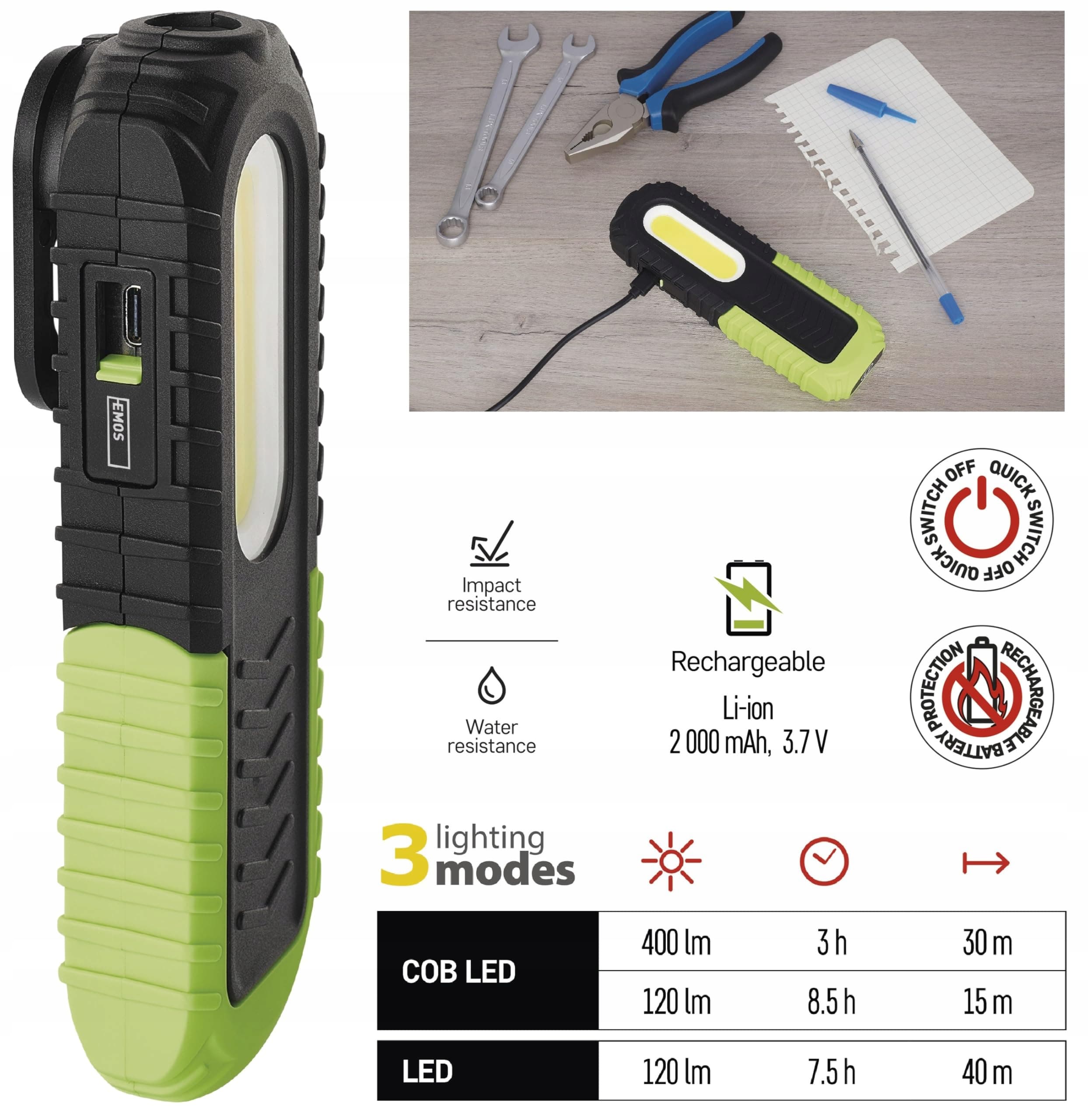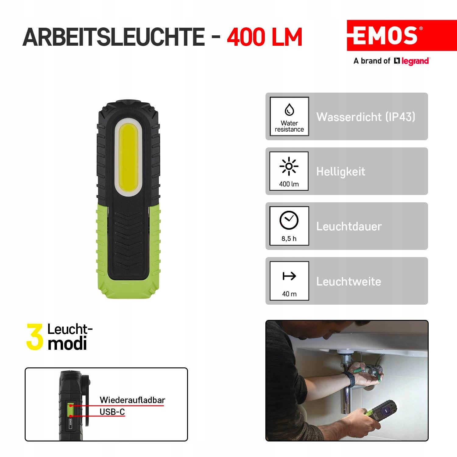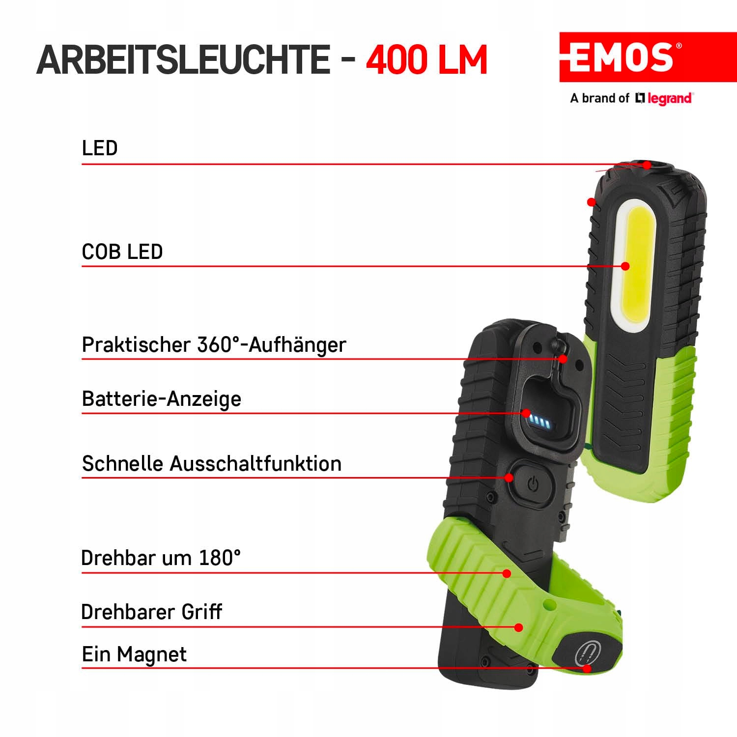 EMOS - ładowalna lampa robocza LED - magnes, hak, regulowana - odporna na wstrząsy, wodoodporna - 400lm, max. 40m - 3 tryby świecenia - 8,5 godziny - kabel USB - IP43 do użytku na zewnątrz - czarno-zielona