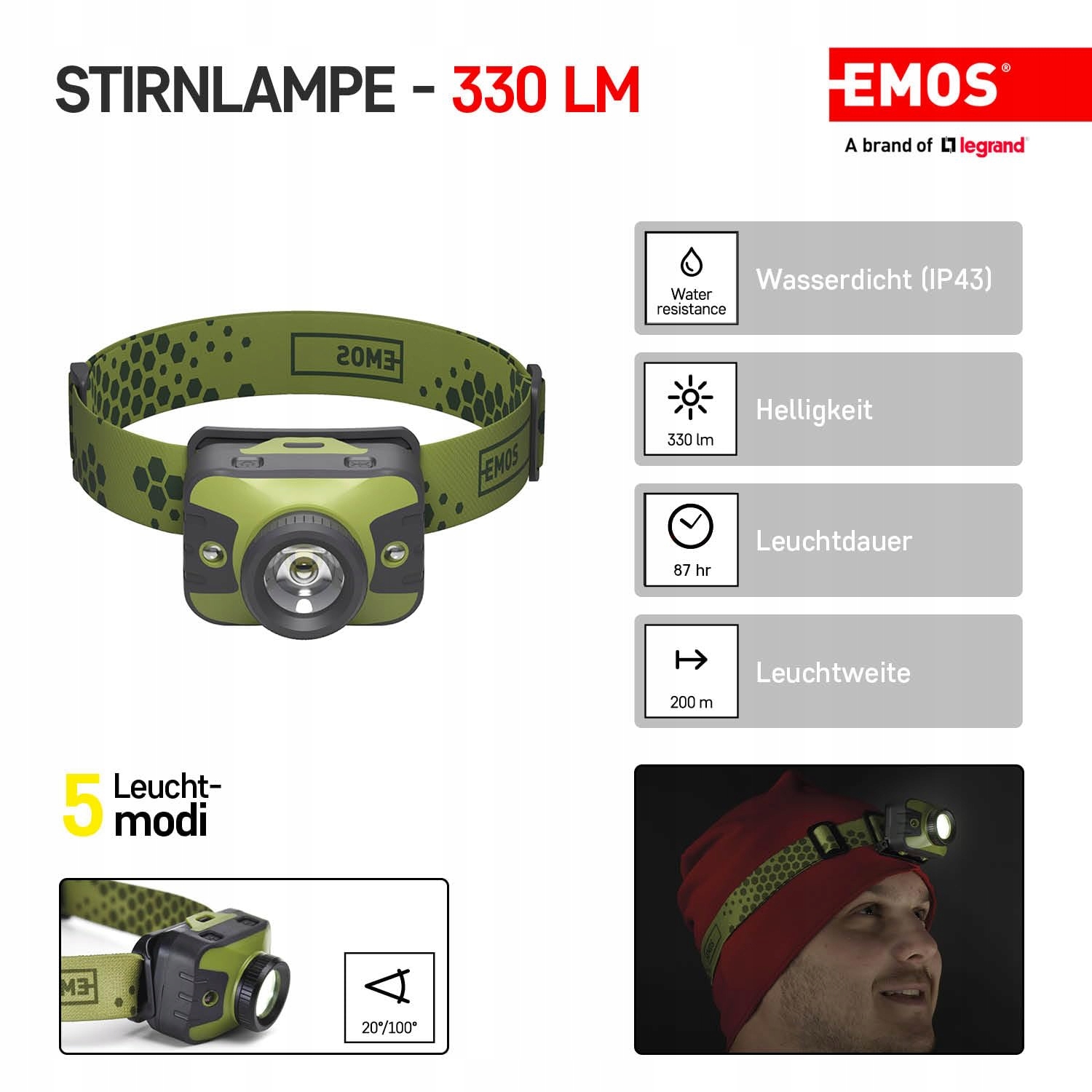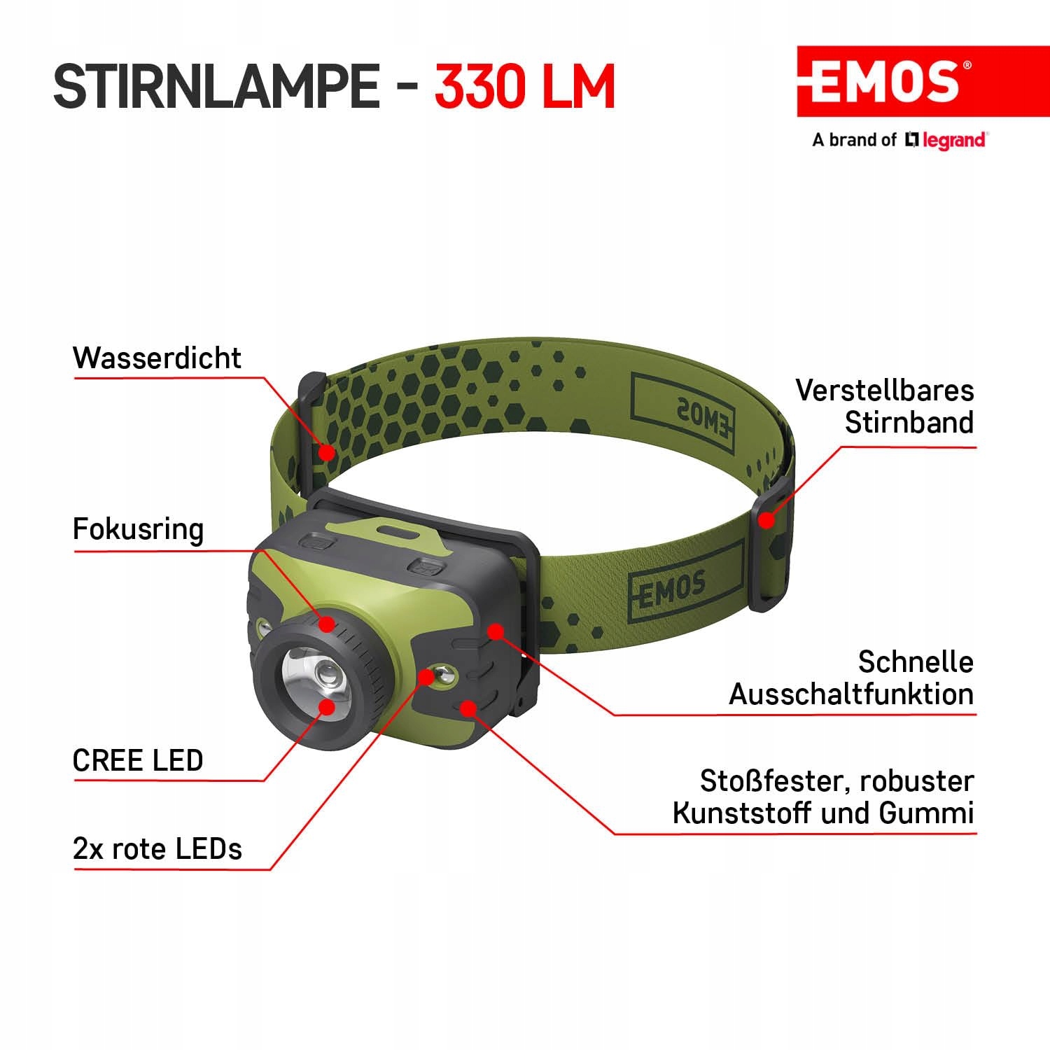 EMOS - Czołówka z funkcją ogniskowania - czerwone światło - jasność 330lm, zasięg światła 200m - 5 trybów świecenia - czas świecenia 87 godz. - wodoodporna, odporna na wstrząsy - regulowany pasek - do użytku na zewnątrz