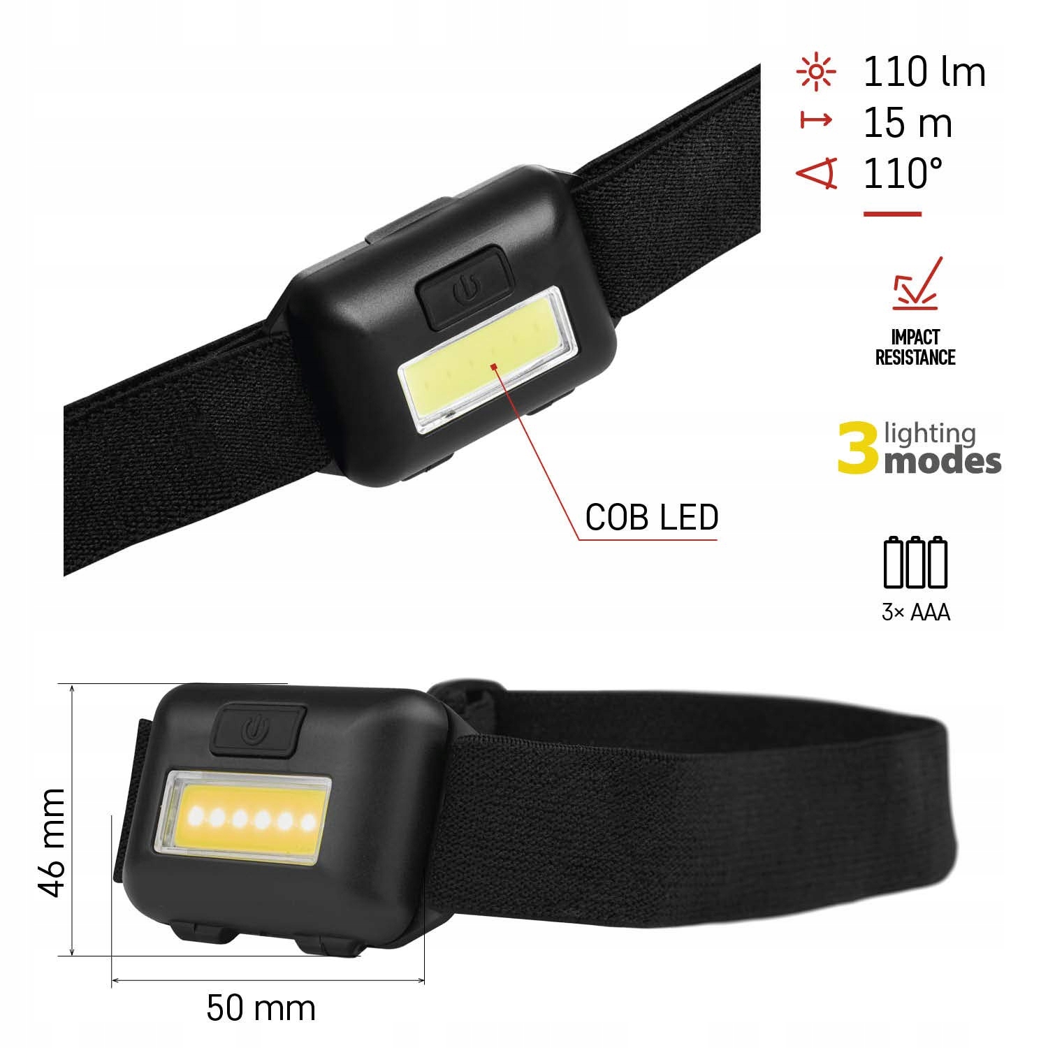MOCNA I LEKKA: Extra lekka czołówka o wadze zaledwie 56 gramów (21 g bez baterii) wyposażona w 3 poziomy świecenia dzięki nowoczesnej technologii COB LED: Maksymalna moc ze strumieniem świetlnym 110 lumenów i zasięgiem 15 metrów / tryb 50% (moc światła 30 lm, wiązka światła 8 m) / SOS miganie (światło ostrzegawcze)