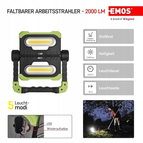 EMOS - składana lampa robocza LED - odporna na wstrząsy lampa robocza - max. 2000lm, max. 70 m - 5 trybów świecenia - 14,5 godziny - kabel USB - do budowy, warsztatu, kempingu - czarno-zielona