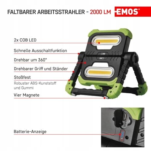 RUCHOMA I MOCNA: Przenośna lampa robocza LED EMOS z uchwytem jest obrotowa i składana, a dzięki 2 źródłom światła COB LED jest szczególnie jasna. Oferuje 5 różnych trybów świecenia (2 COB LED 100%/50%, 1 COB LED 100%/50%/25%). (EMOS P4536)